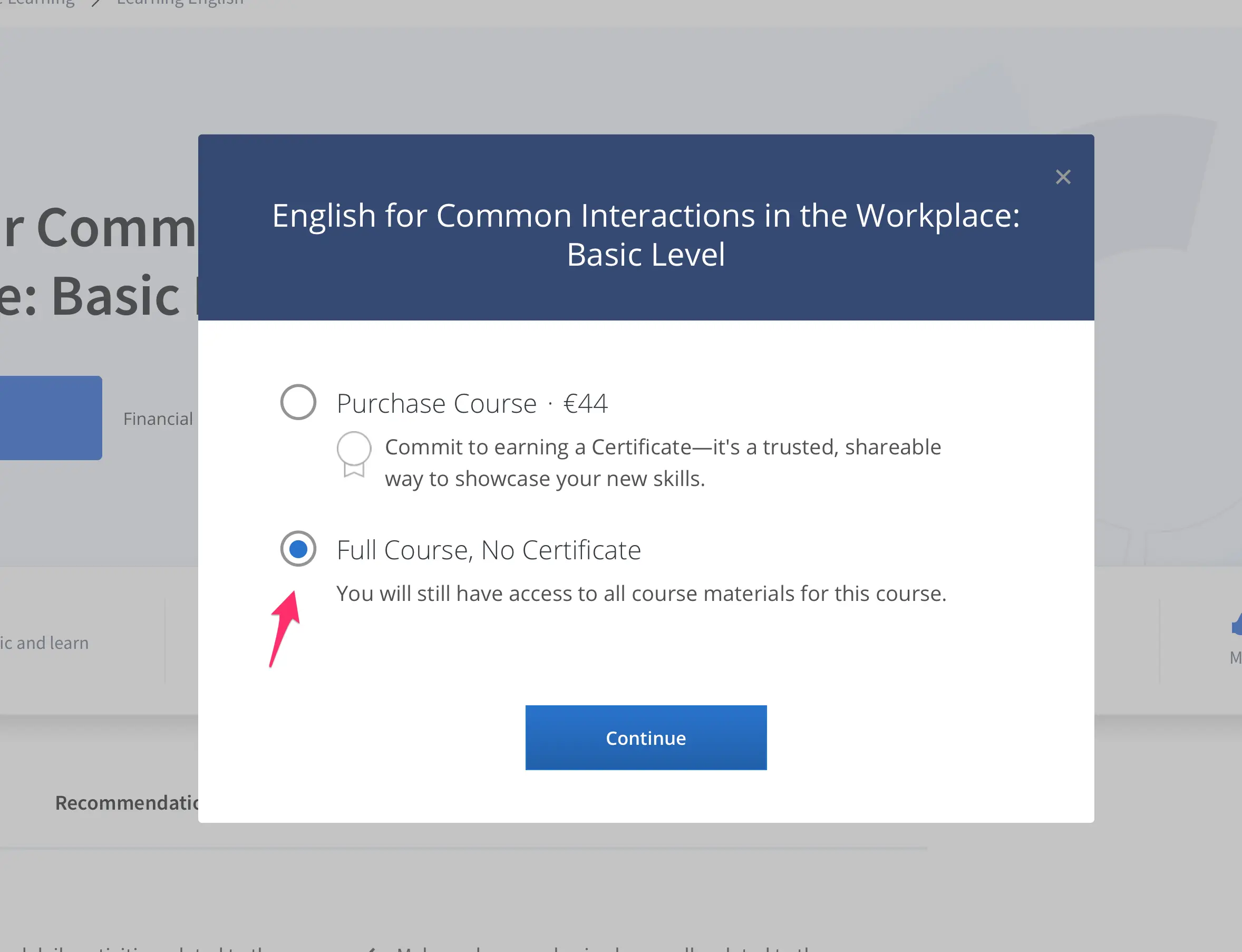 When you click the "Enroll Now For Free" button to register, you'll be asked if you want to access the full course material for free or pay to get the course and the ability to earn a certificate.