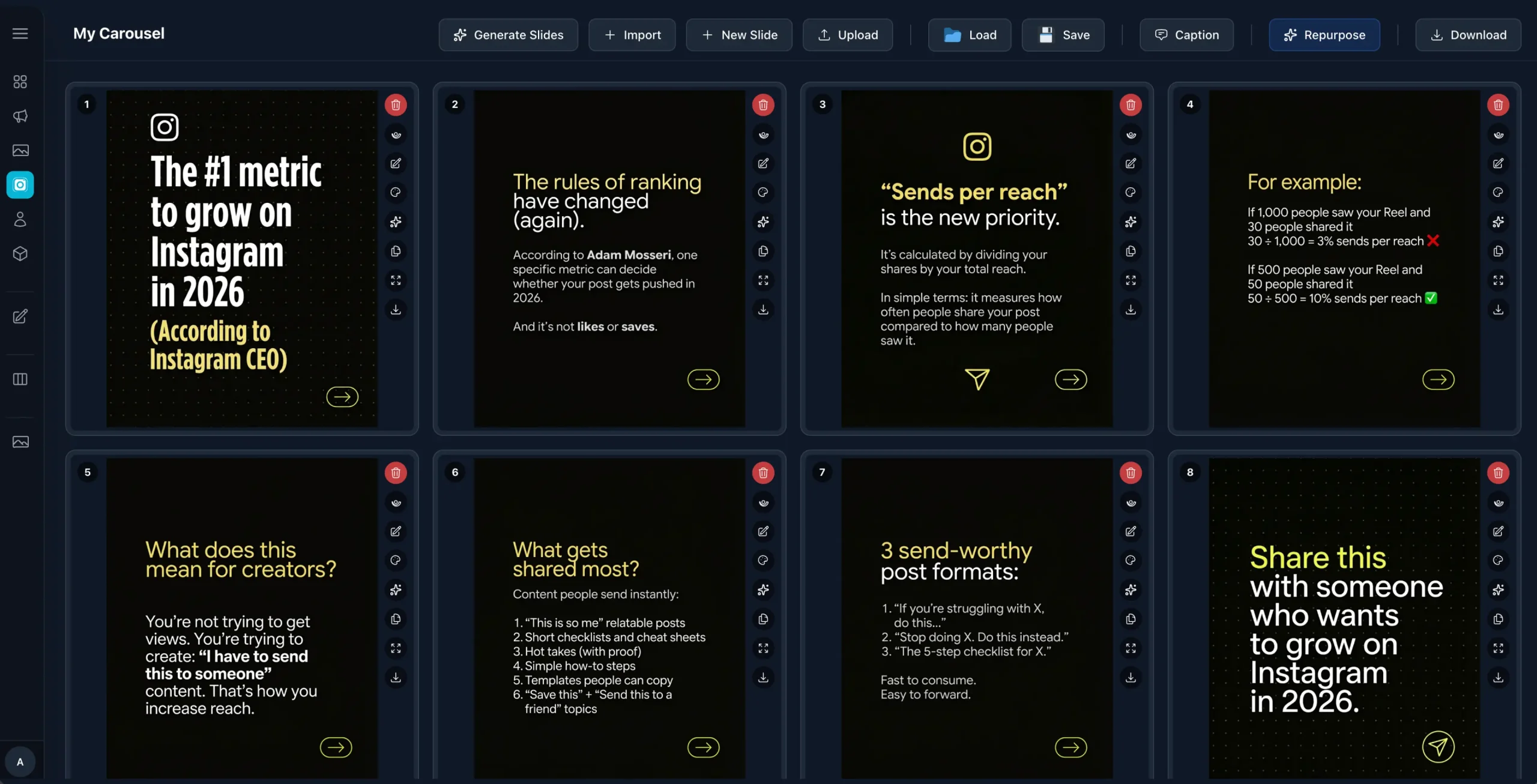 You can clone viral carousels in minutes - This is the only Instagram tool that lets you import a carousel from a link, rewrite it with AI, and restyle it in one editor, ready to publish fast.