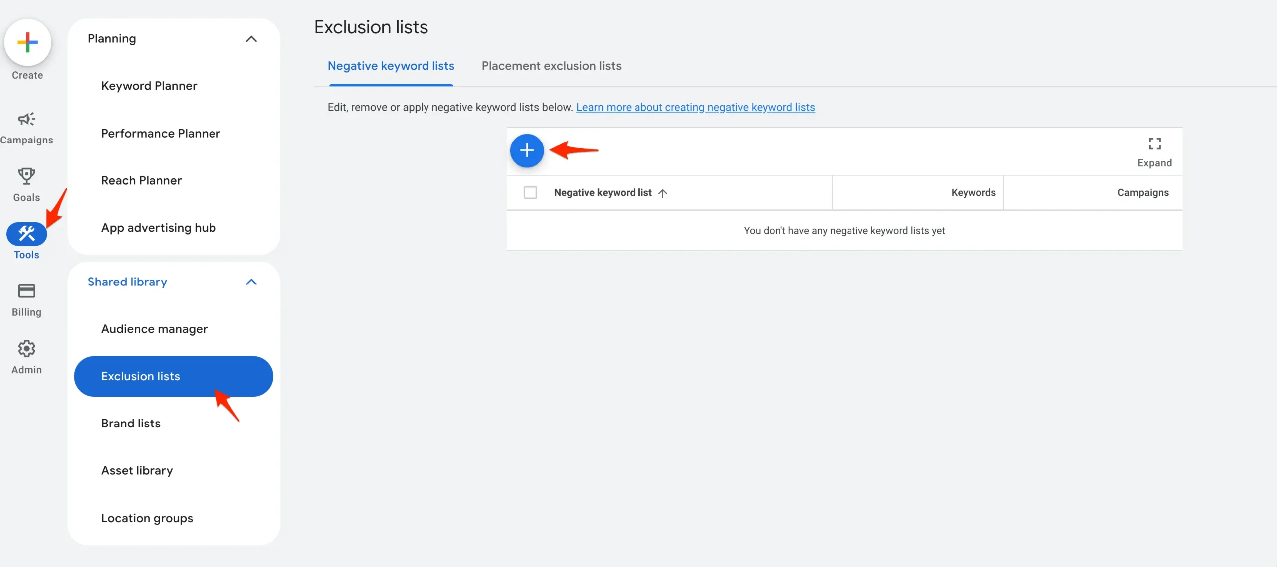 To create a negative keyword list, click the TOOLS option from the left menu and select EXCLUSION LISTS (under Shared Libray).