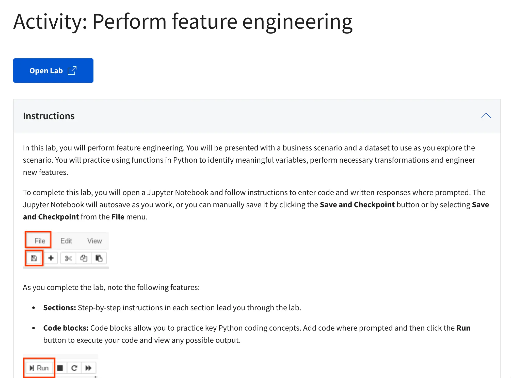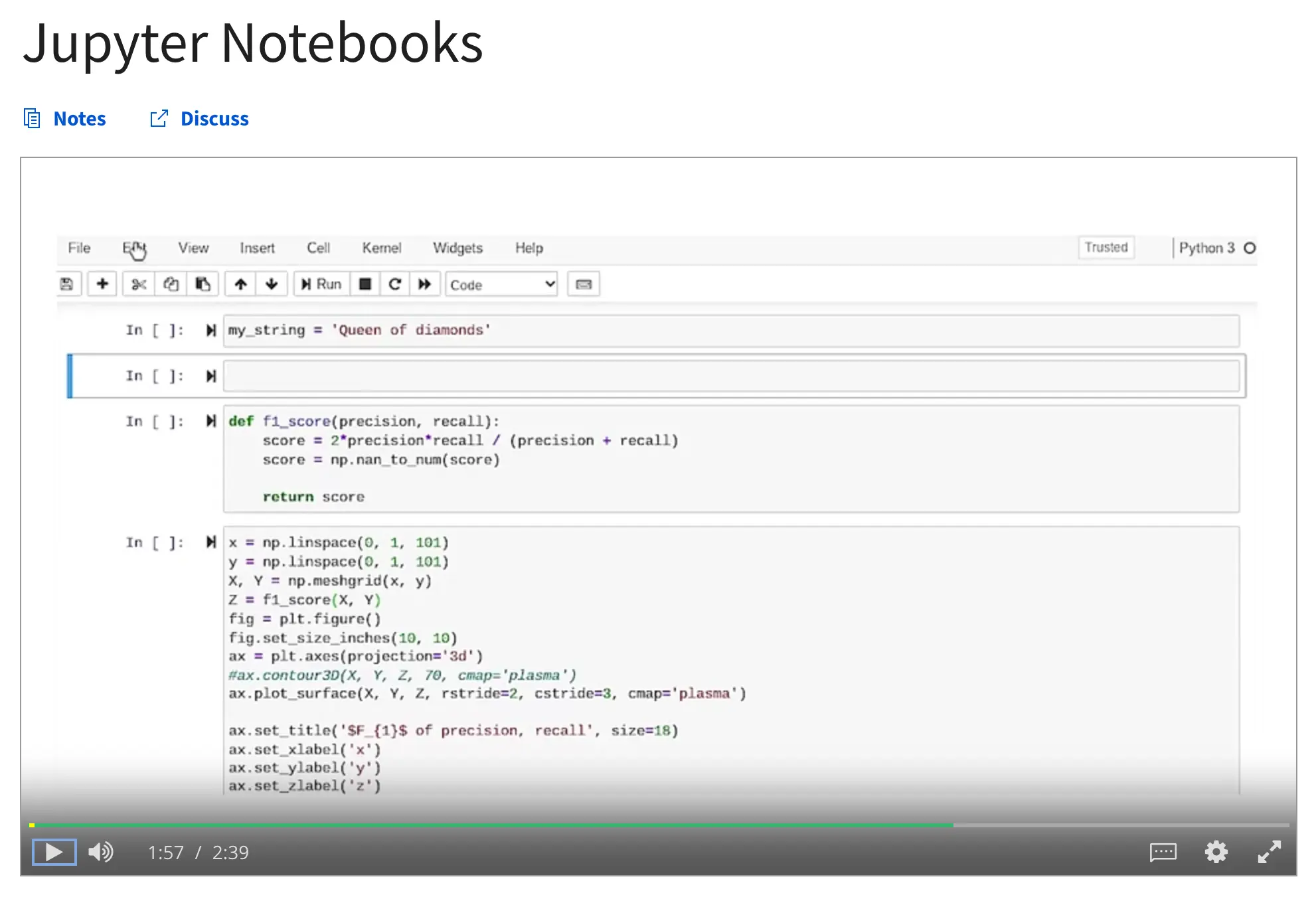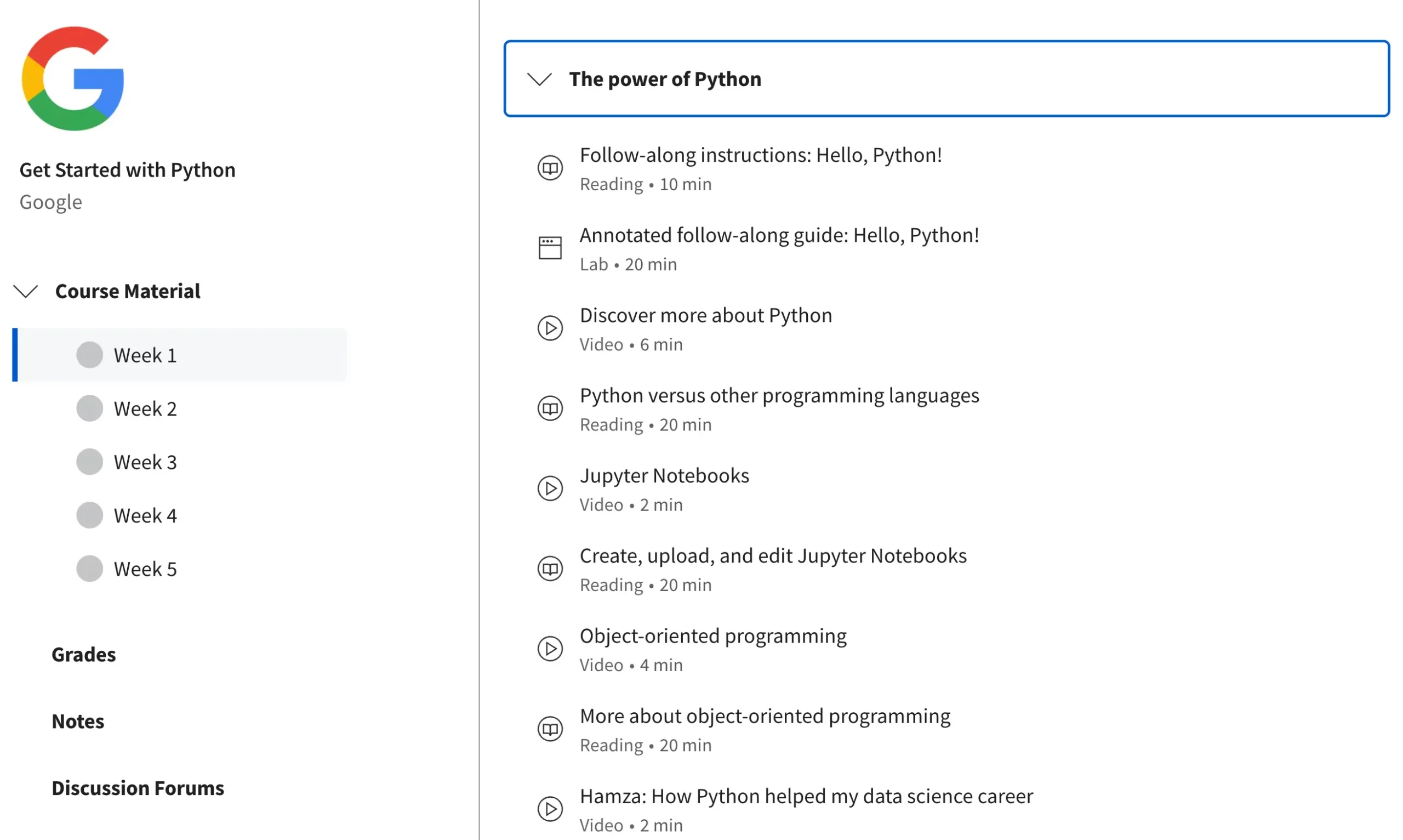 Besides the videos, the learning material includes several reading resources and practice labs in Jupyter.