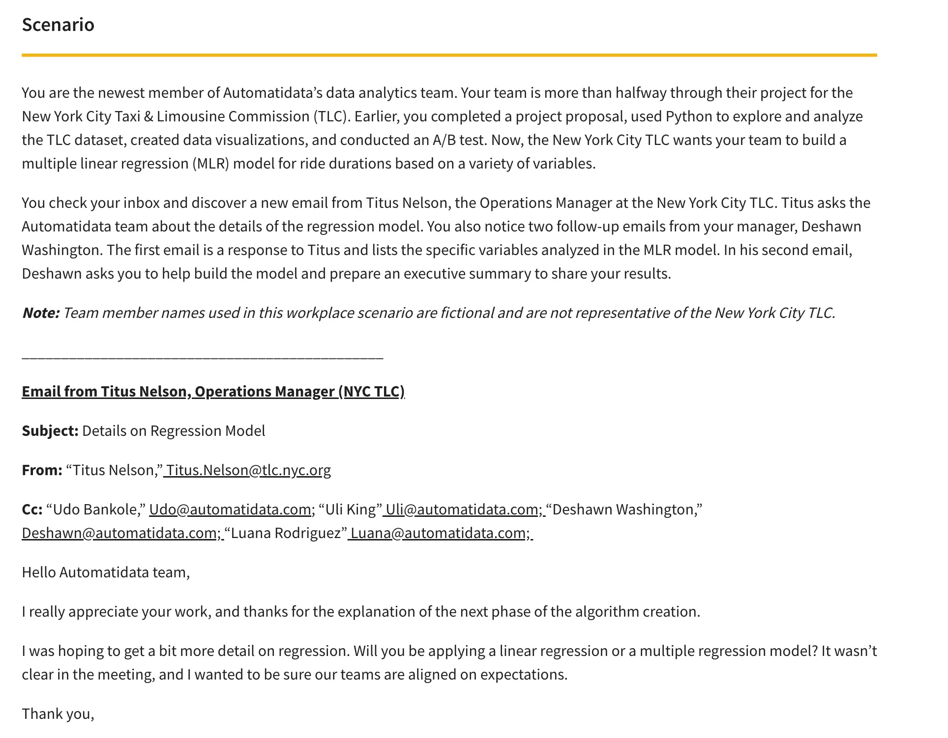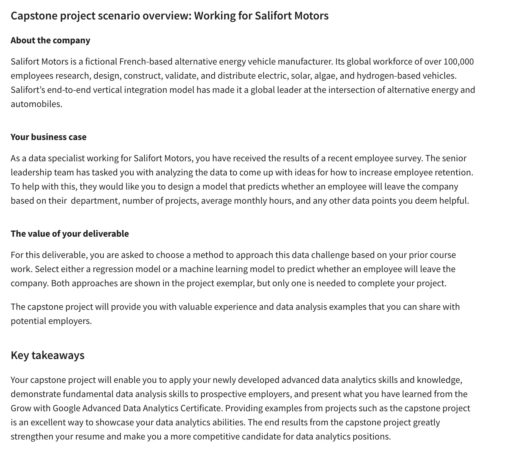 The scenario of the capstone project is pretty interesting too. You’re working as a data specialist for a fictional Frech-based alternative energy vehicle manufacturer. Your task is to analyze the results of a recent employee survey and develop ideas to increase employee retention.