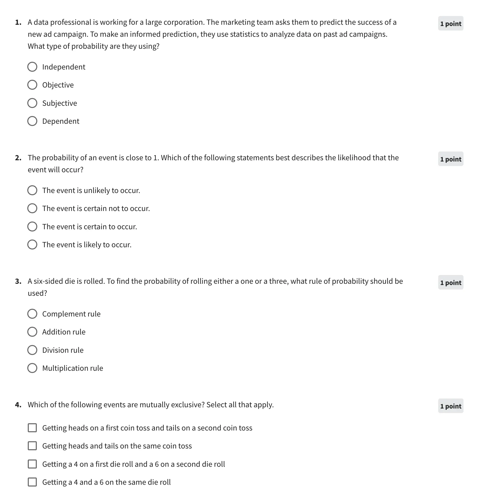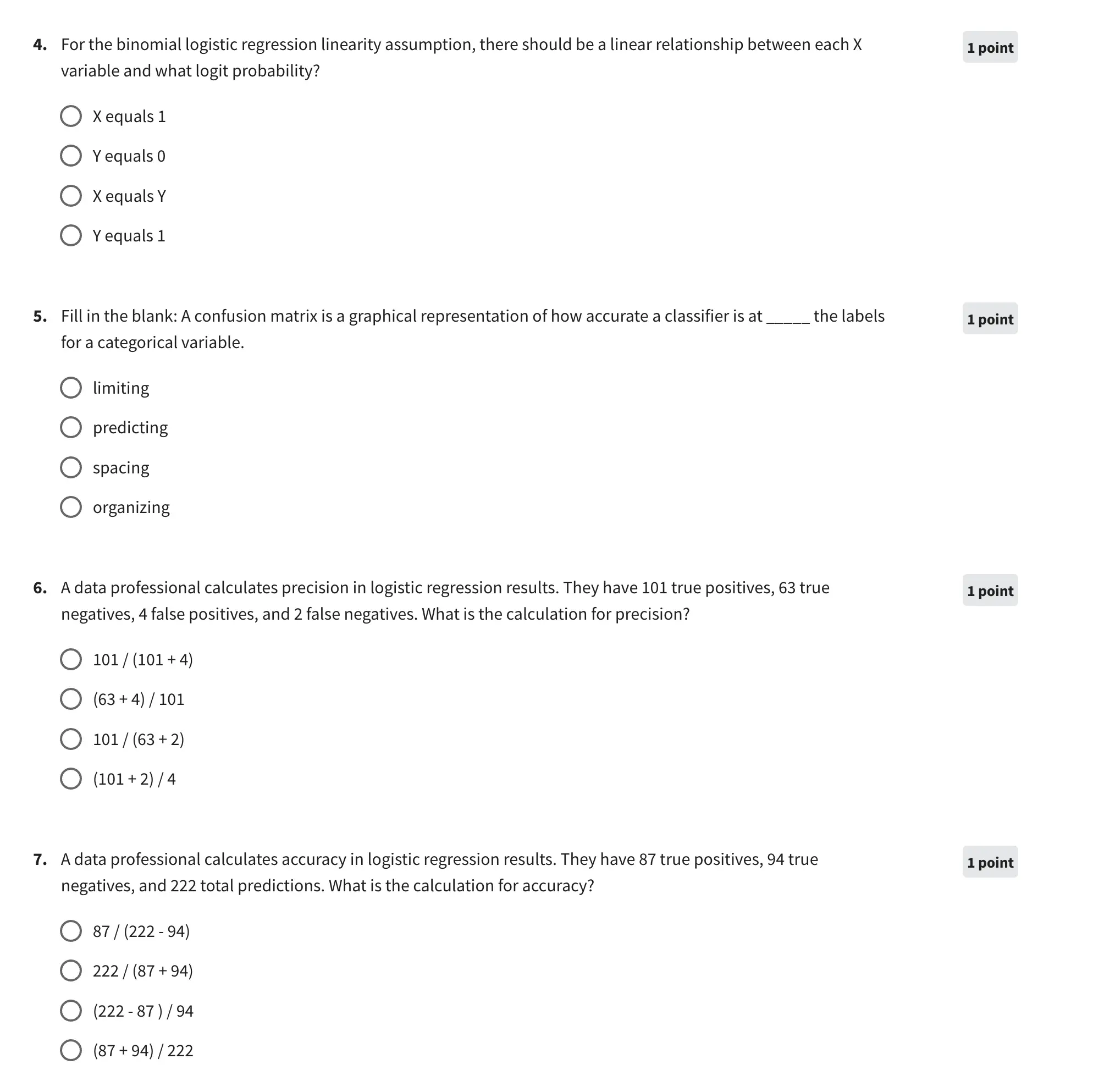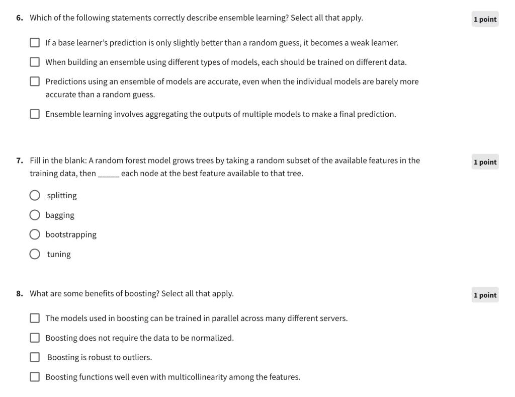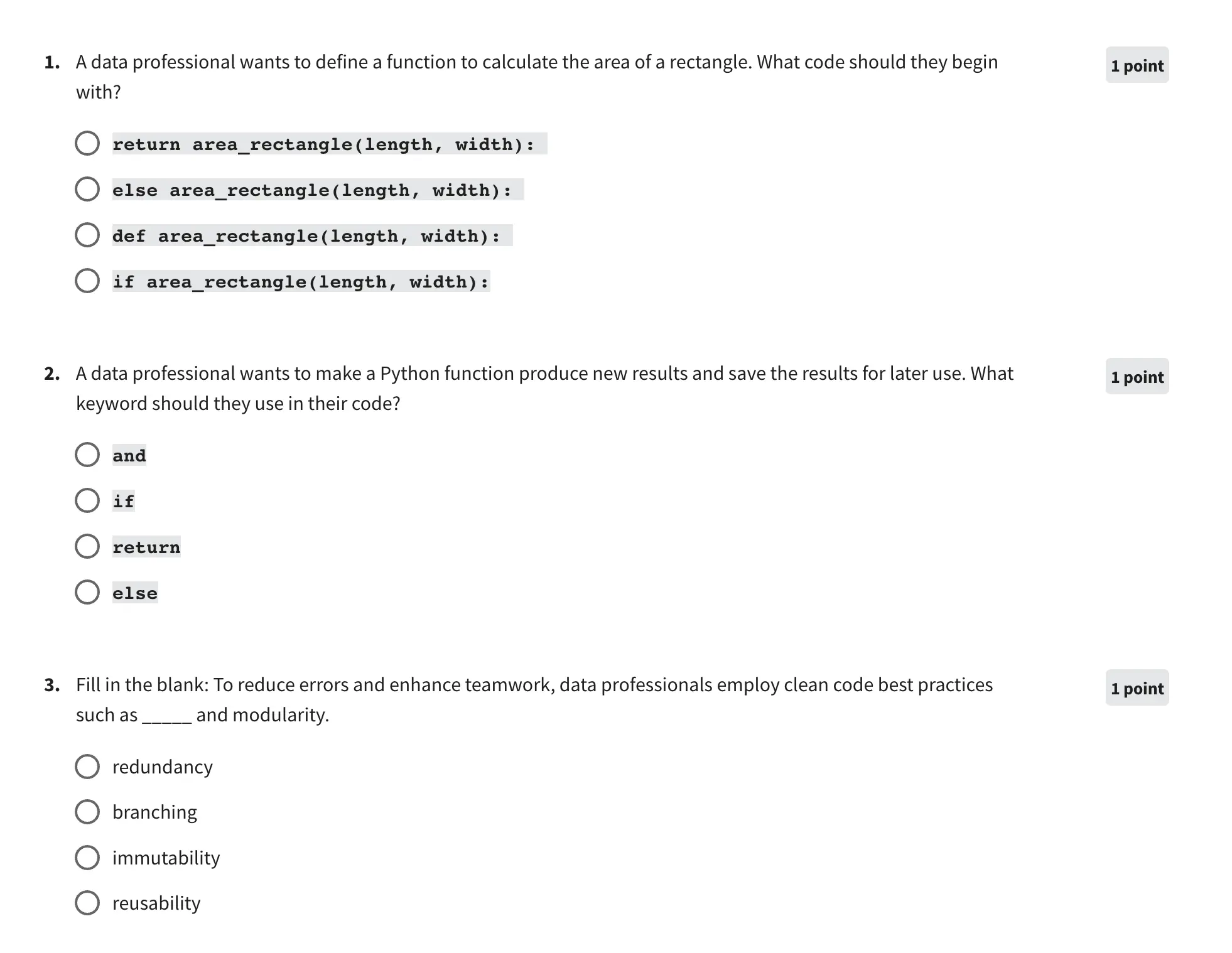 The quizzes are easy to do and straightforward. Below are a couple of sample questions to understand what the exams look like.