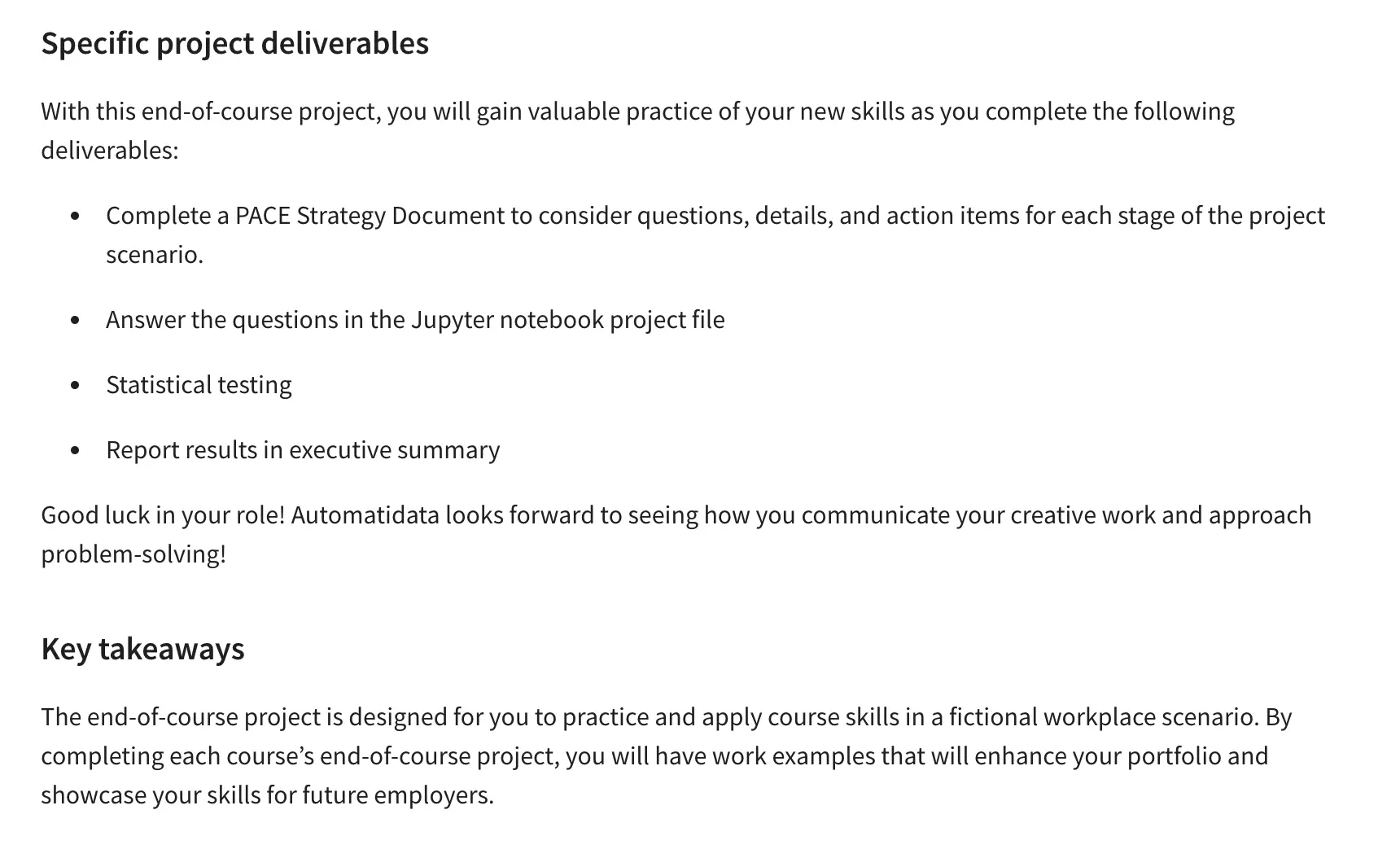 In week 6, you’ll have to complete the end-of-course project. The deliverables include a PACE strategy document, statistical analysis, and executive summary reporting.
