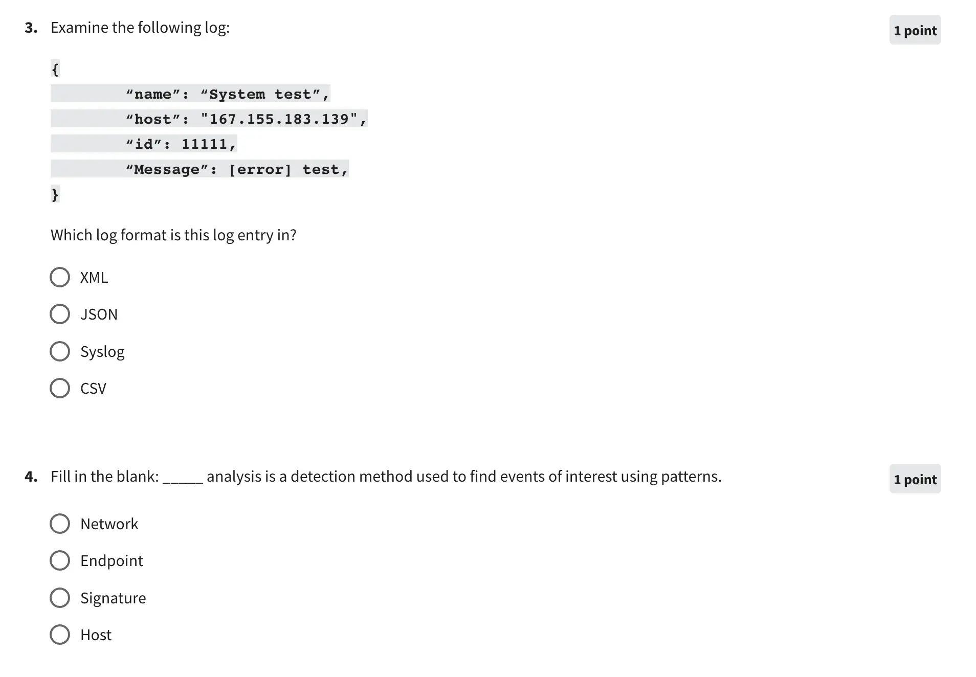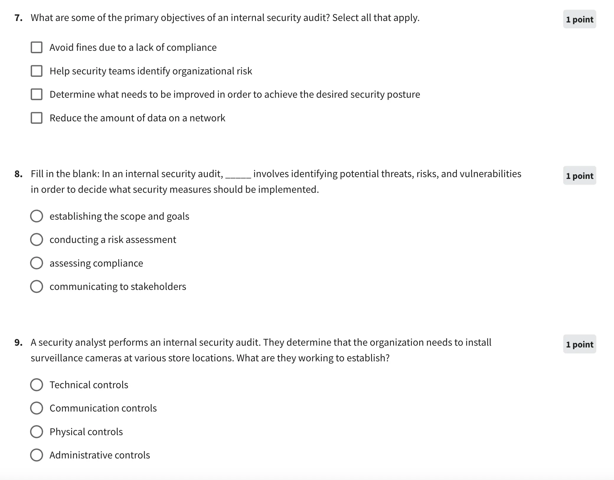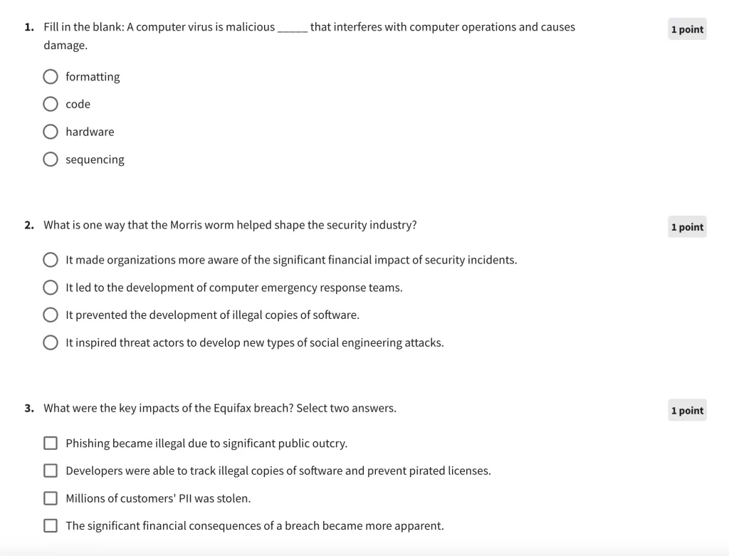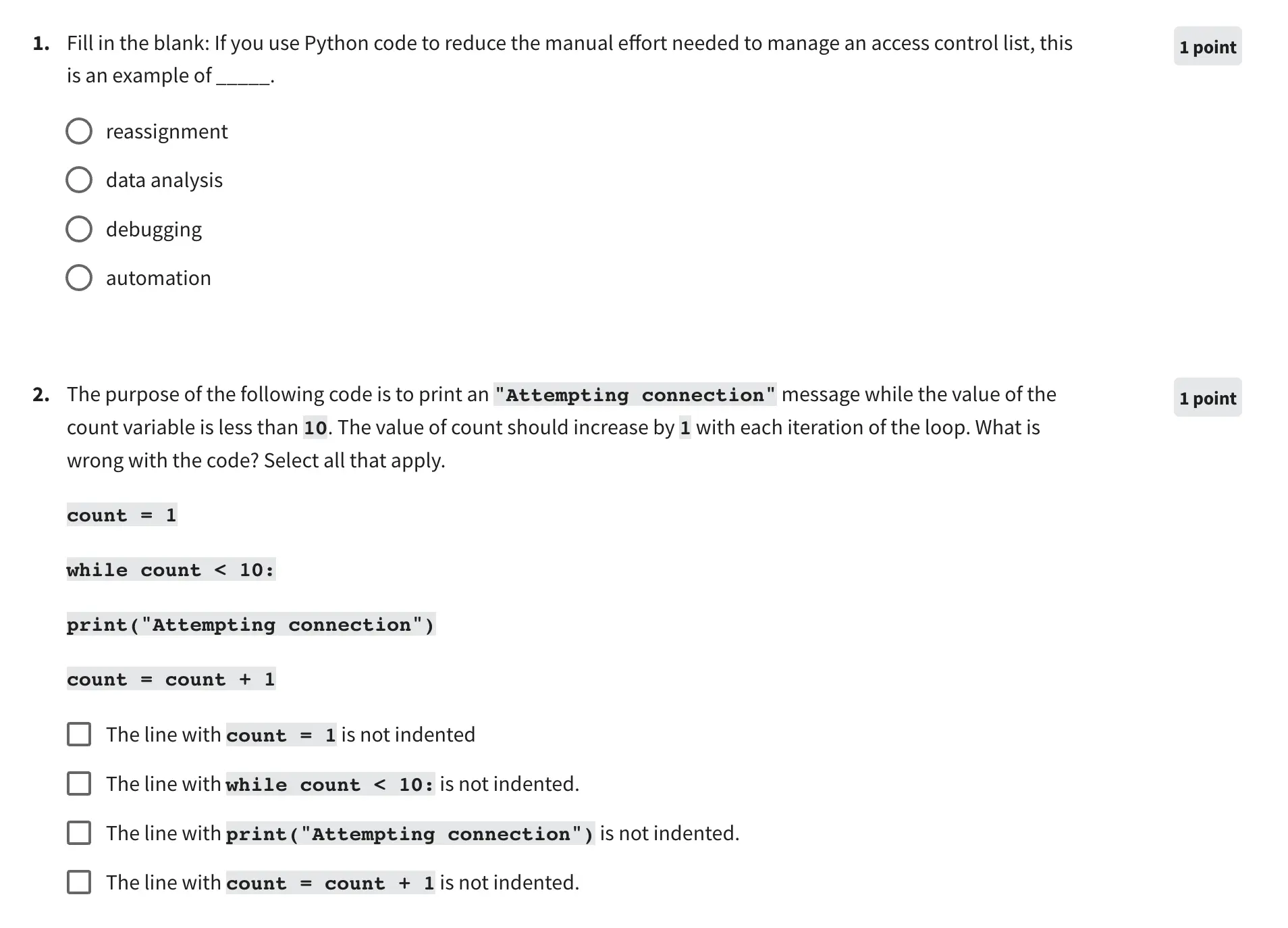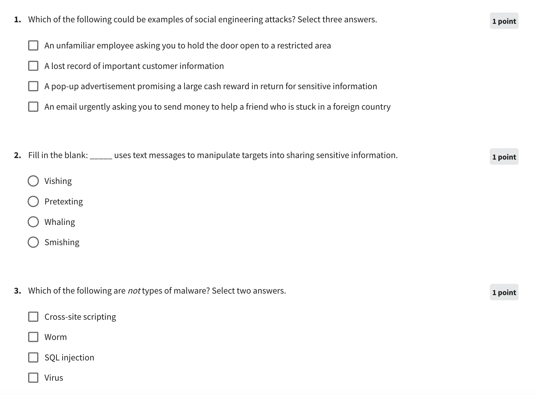 The assessment of this course includes 4 graded quizzes. You can see a couple of examples below.