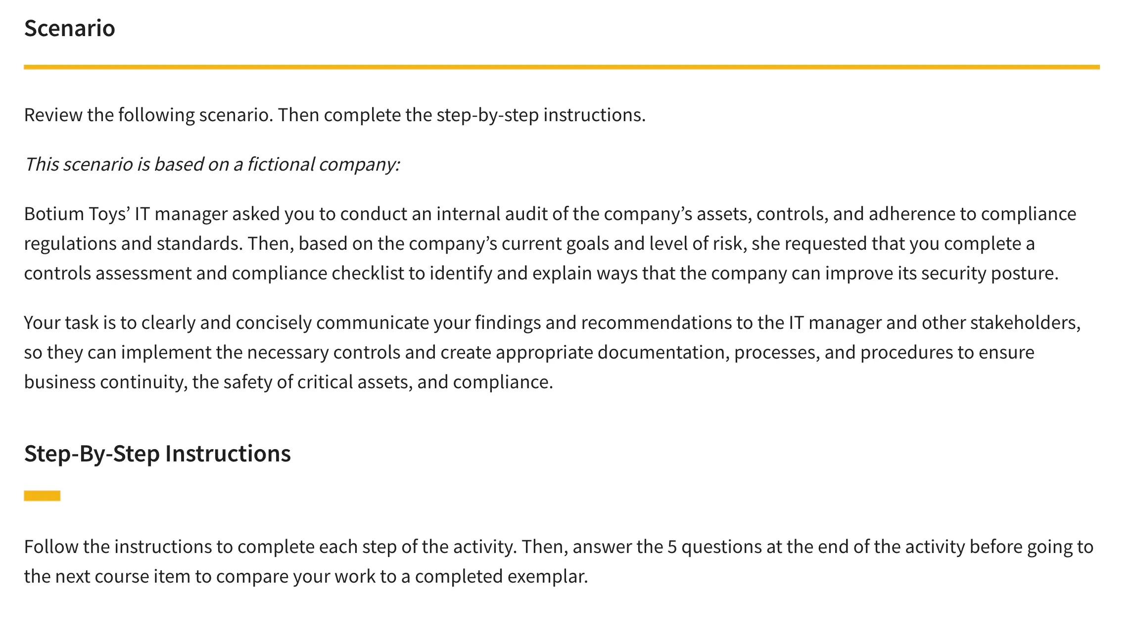 As part of the assessment, you will have to complete your first portfolio activity, which is a controls assessment and compliance checklist to identify ways Botium Toys (a fictional company) can improve its IT security.