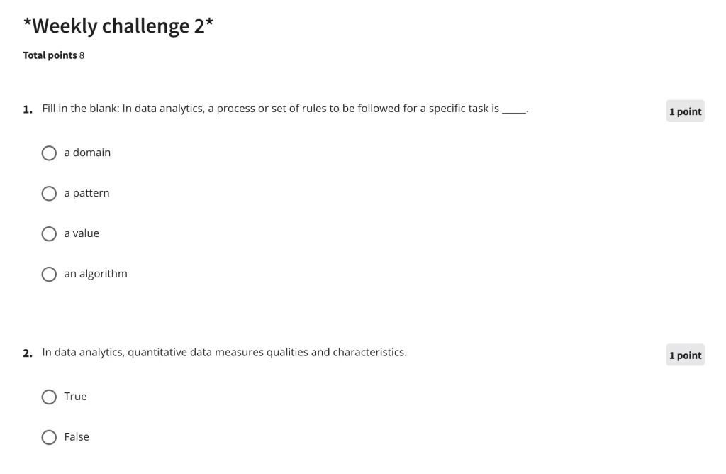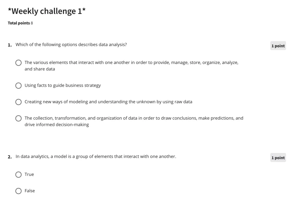 Nevertheless, if you plan is to become Google Data Analytics certified, you’ll have to go through this course and complete all exams (6 graded assignments in total).