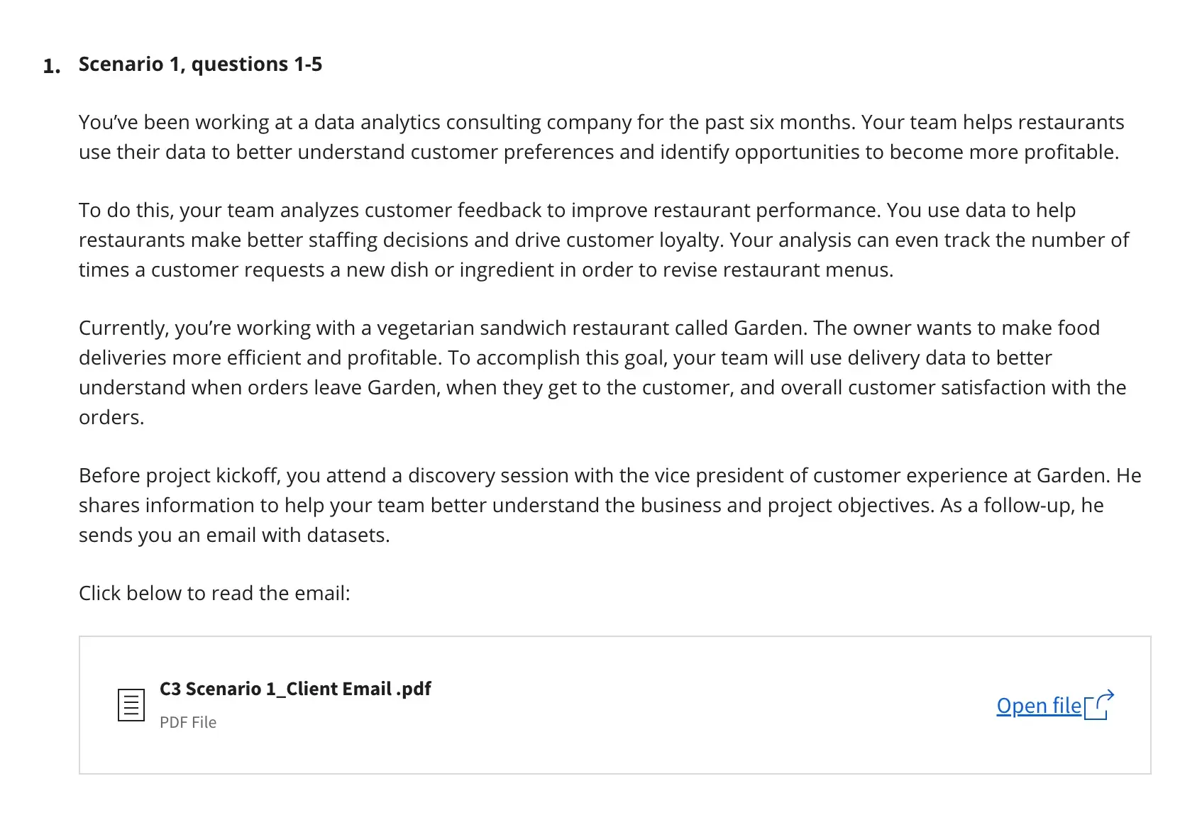 You'll have to choose a scenario, ask questions, prepare, process, and analyze data to answer those questions. In essence, you’ll have to combine all the skills learned in the previous seven courses.