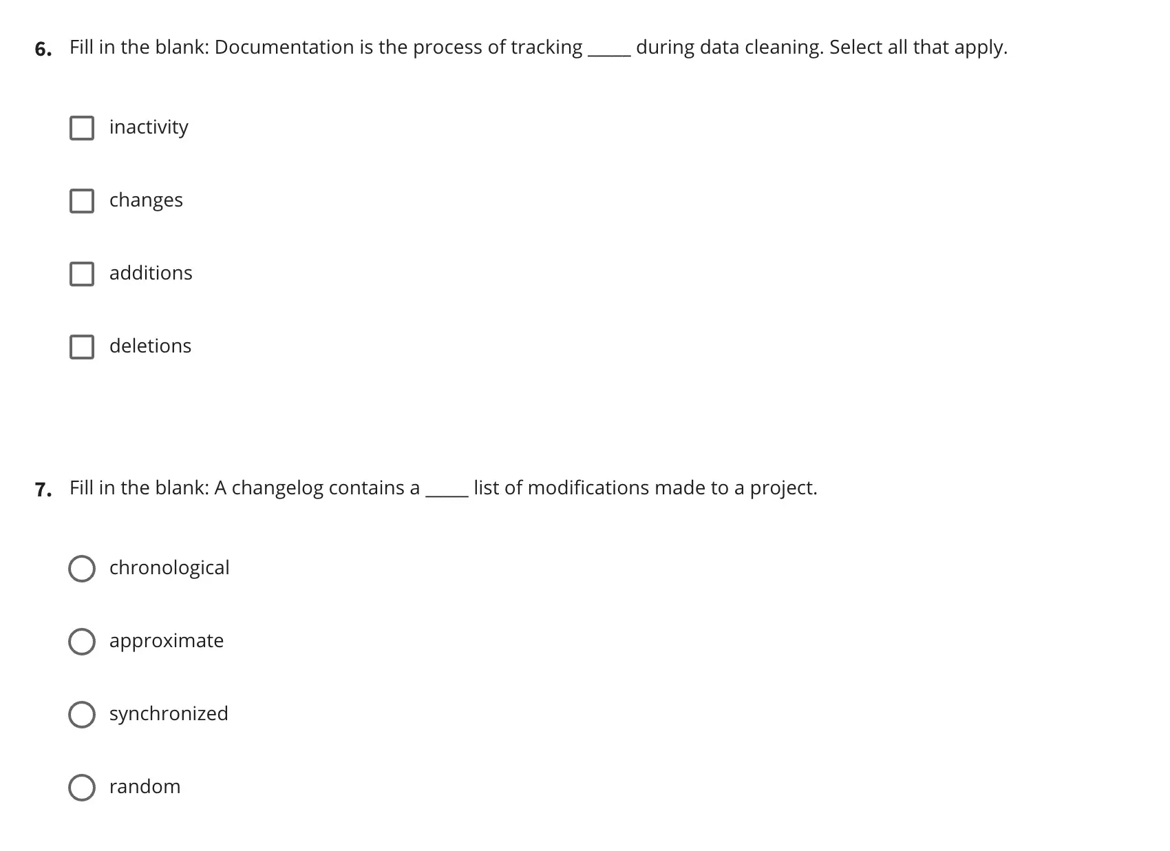 This course has four quizzes and a course challenge exercise that gives you the opportunity to apply your data cleaning skills in practice.