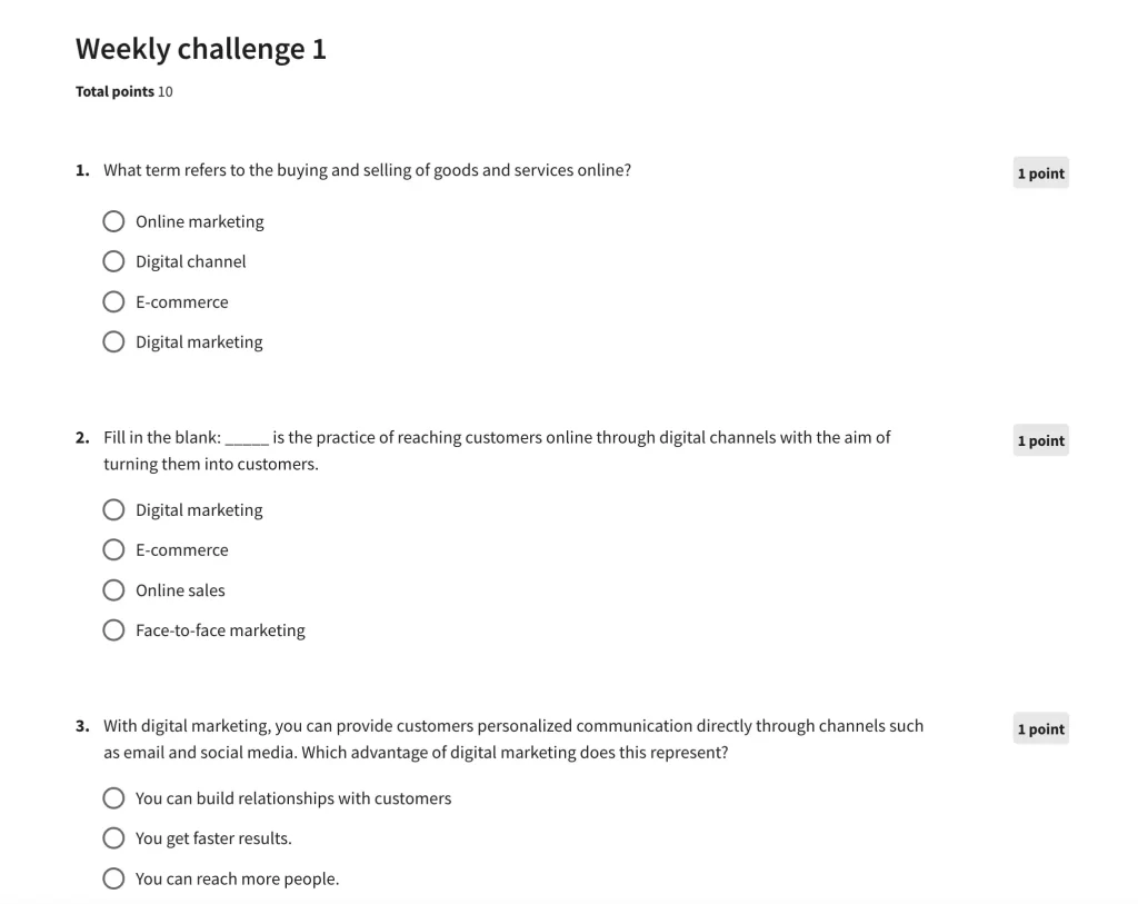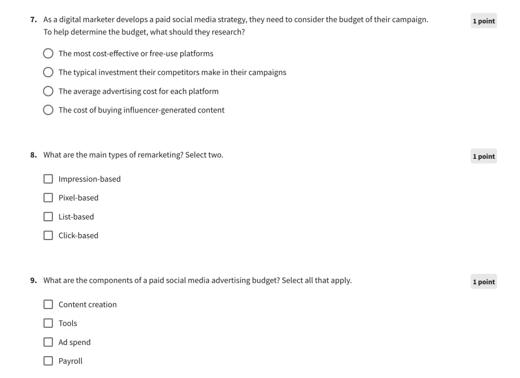 All quizzes are in the form of multiple-choice questions and are easy to complete. In case you fail to pass a quiz, you can make 3 attempts every 24 hours.