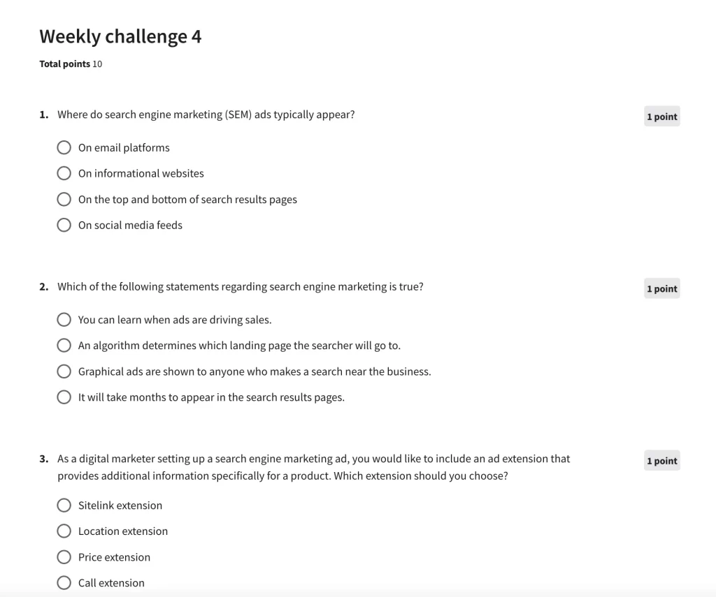 For example, the course touches on Google Ads reports but does not cover in detail how to optimize a Google Ads campaign based on the results of your analysis. They provide additional resources to achieve this but it's not part of the main course material. Students who need to become experts in Google Ads can take the official Google Ads Certification or follow a third-party Google Ads training course.
