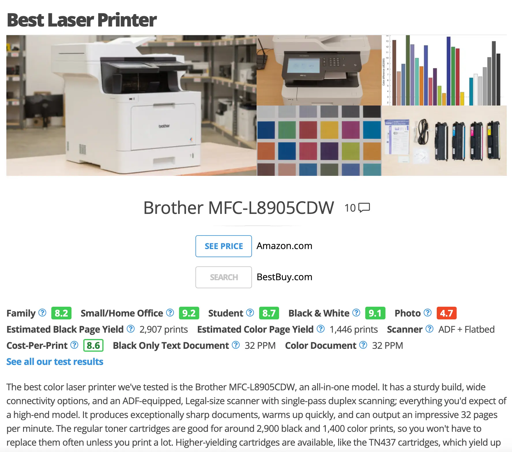 Look at this example for the term "best laser printer". The page ranking in the top position offers different printers (grouped by category) together with their best features and one paragraph summarizing their review findings.