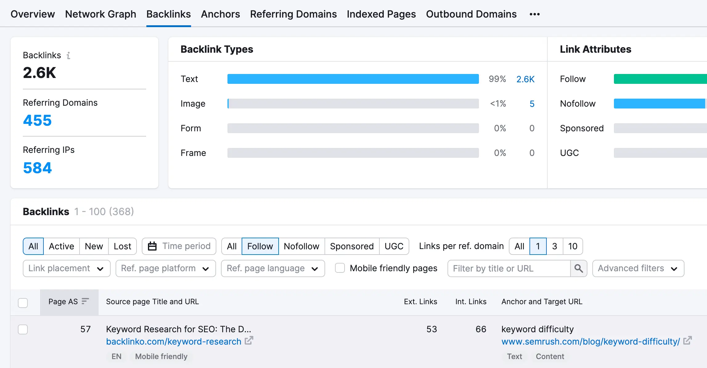 If you do the same with the second URL, you'll see that it has 2.6K links from 455 domains.
