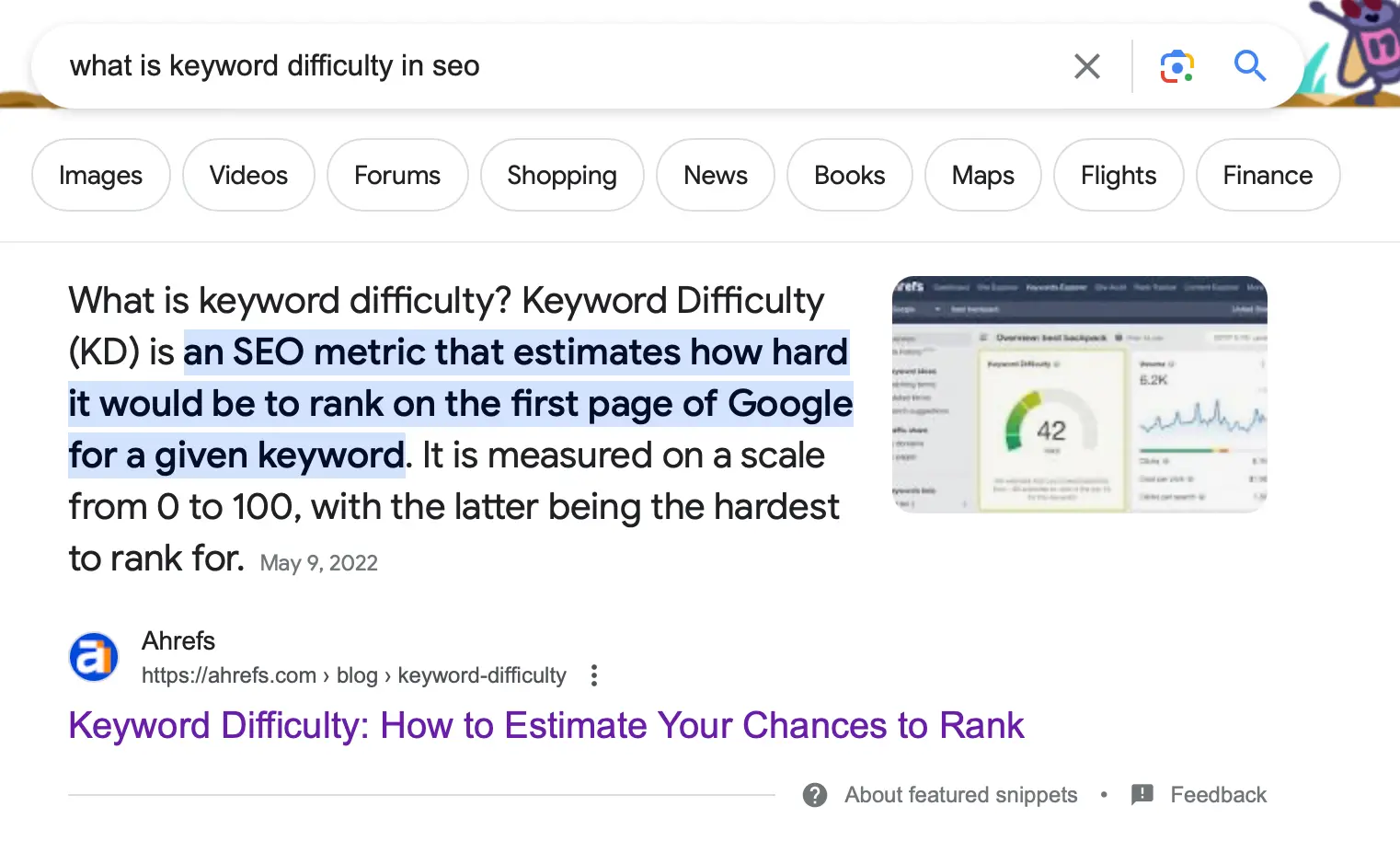 For example, if you want to rank for the term "what is keyword difficulty in SEO" the first step is to perform a Google search. At the time of writing this post, my results look like this: