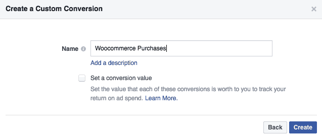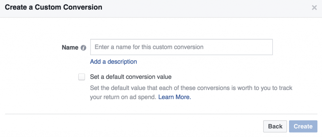 Click Create a Custom Conversion. Add a name and select a data source. This will be your pixel unless you are tracking an offline event.