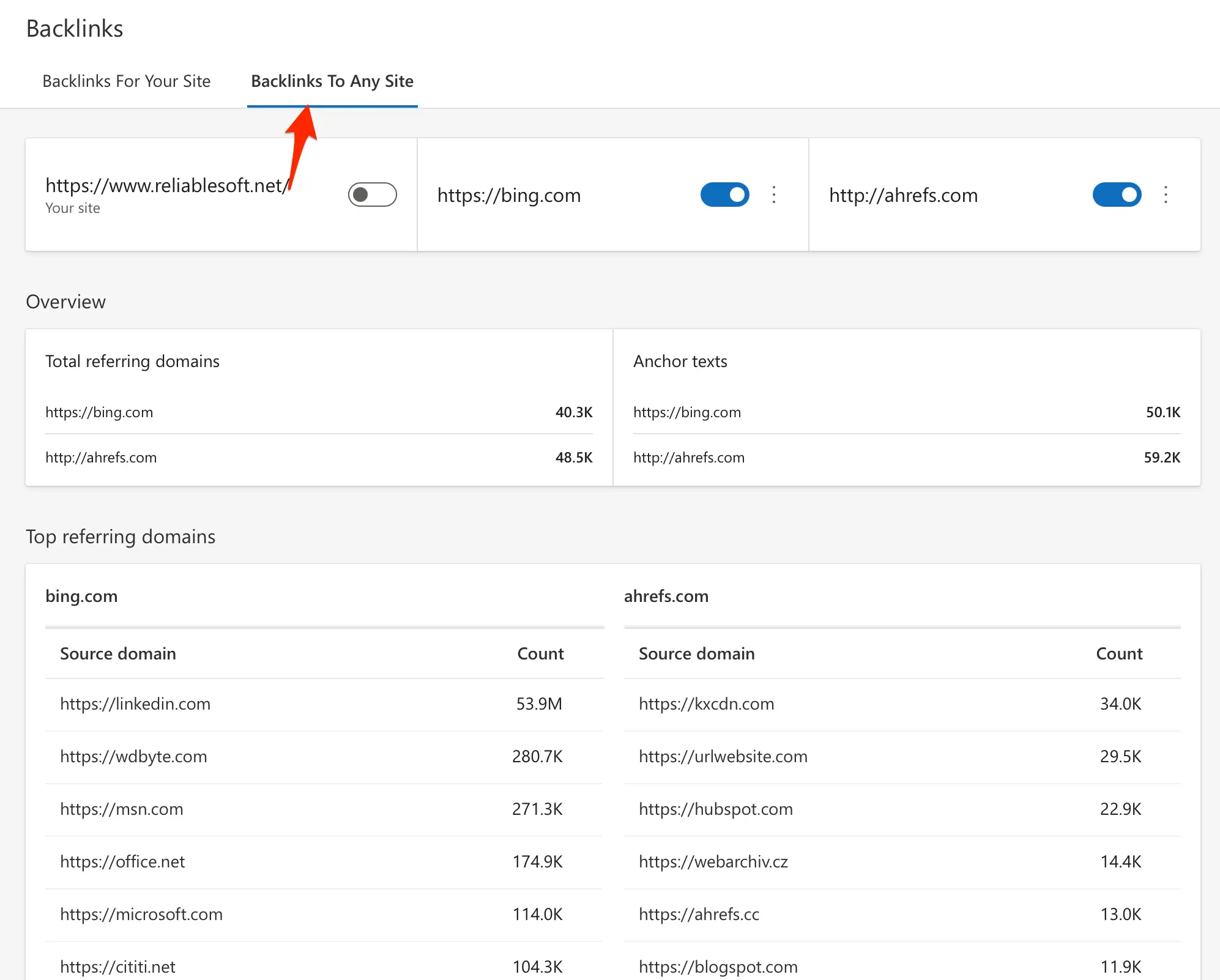 One of the unique features of Bing Webmaster tools is the backlinks report. Besides getting details for your backlinks, you can view and compare backlinks for any website.
