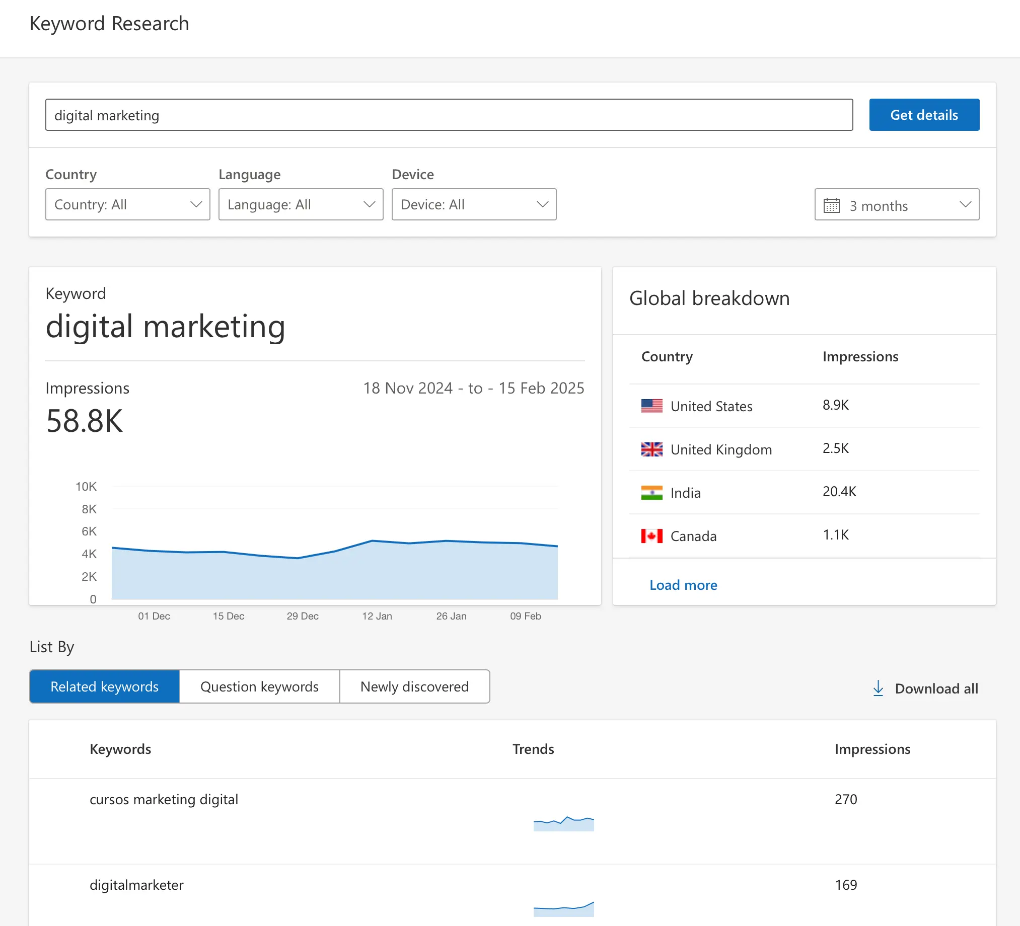 Bing also has a keyword research tool. This tool is useful if you want to know how many times a keyword is searched on Bing.