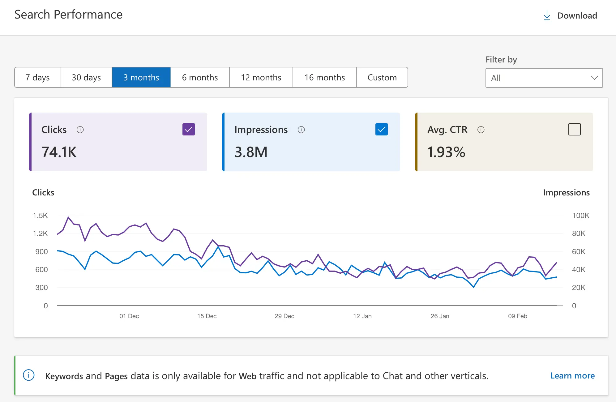 The "Search Performance" report shows the amount of traffic your website received from Bing (and Yahoo) and for which keywords. It does not include traffic data from Microsoft Copilot or other AI chats powered by Bing.