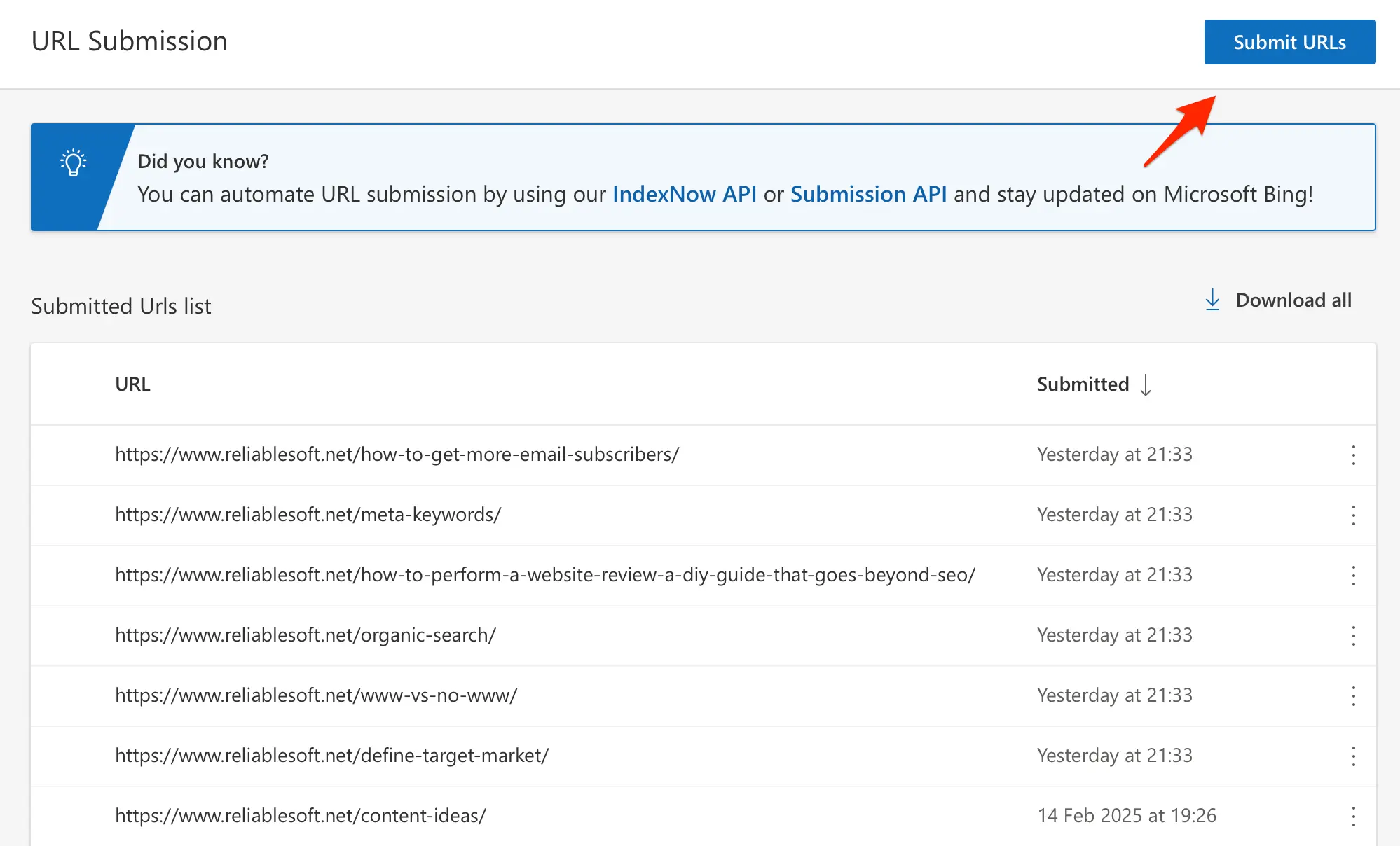 - Enter the URLs you want to submit to Bing and click SUBMIT.