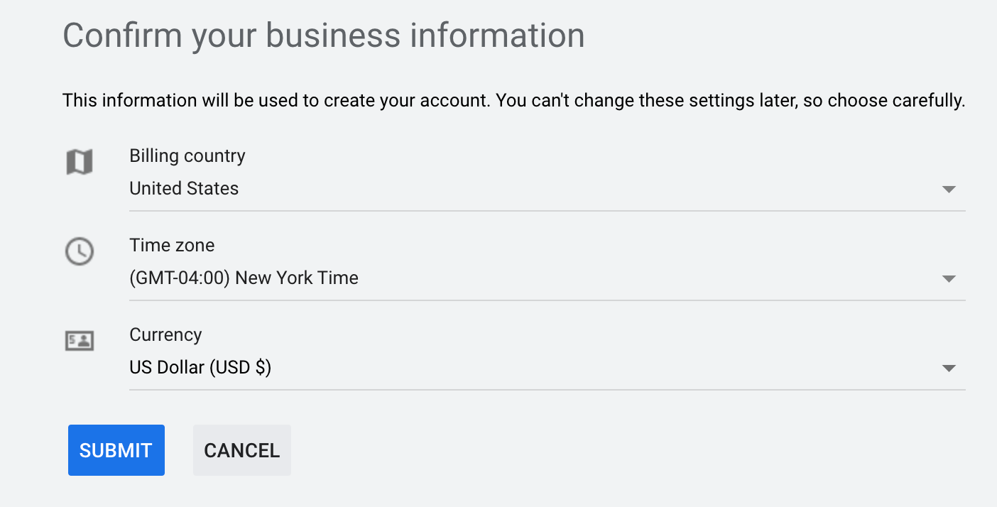As a final step, you must choose your Billing Country, Time Zone, and Currency.