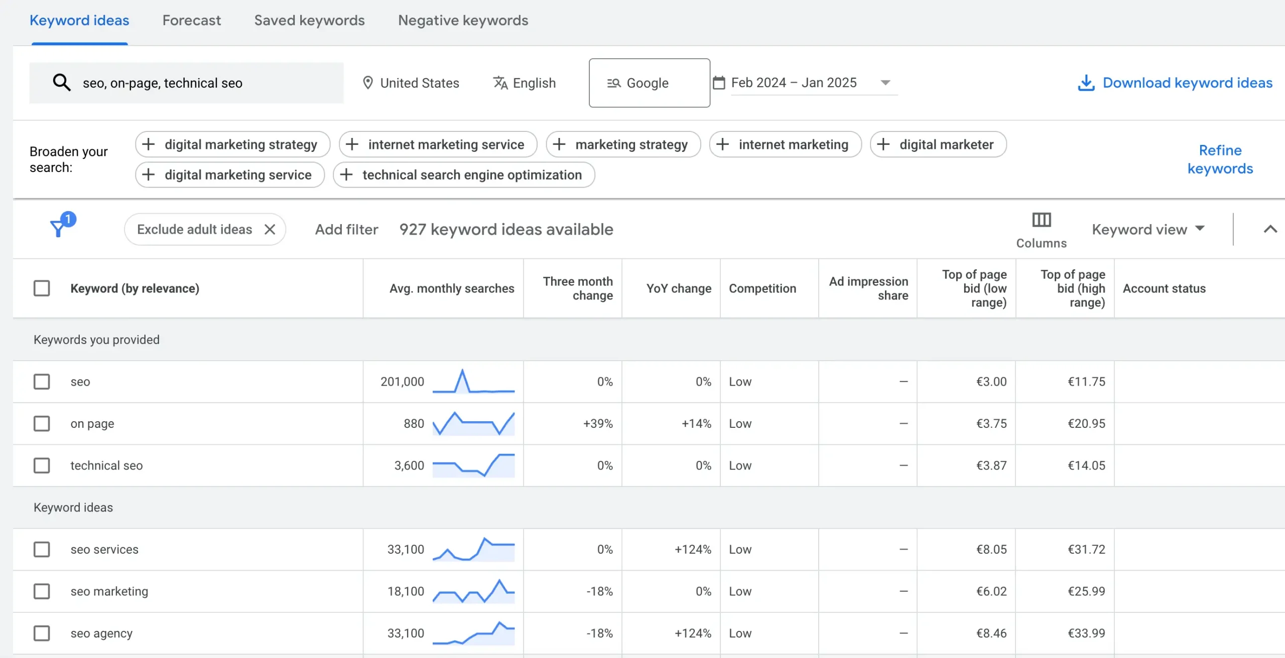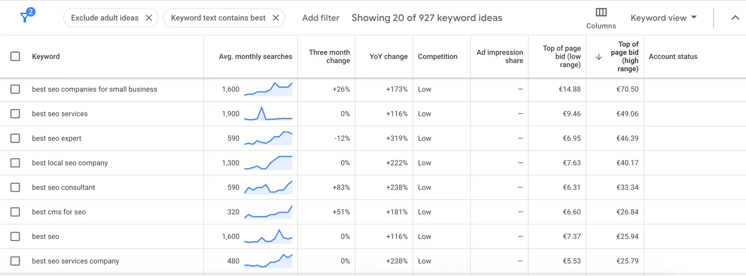 The “Top of page bid (low range) and “Top of page bid (high range)” columns show how much you will pay per click if you target the particular keyword in your paid ads. While this is primarily for PPC campaigns, as you’ll see below (Step 3), it can also be used for SEO.