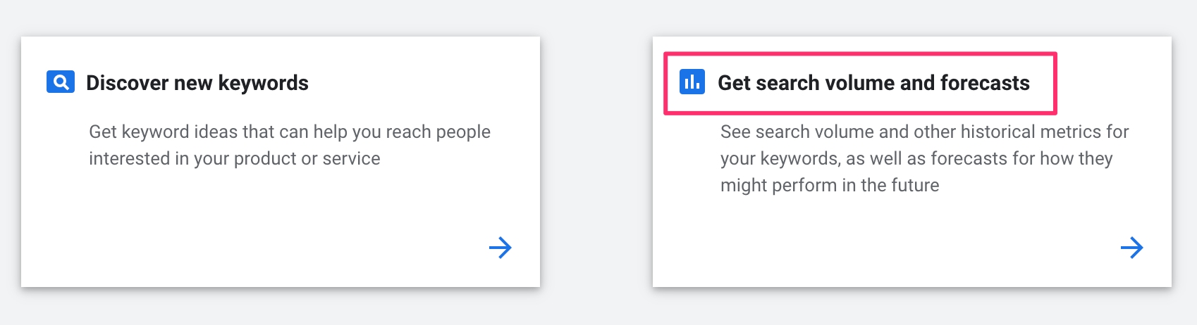Another nice feature of Google Keyword Planner is the “Get search volume and forecasts” tool. To open it, click “Get search volume and forecasts” from the main menu.