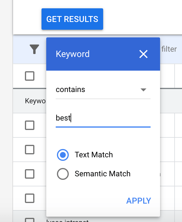 To do this, click the “ADD FILTER” button and select “KEYWORD”. Type one of the above keywords and click APPLY.