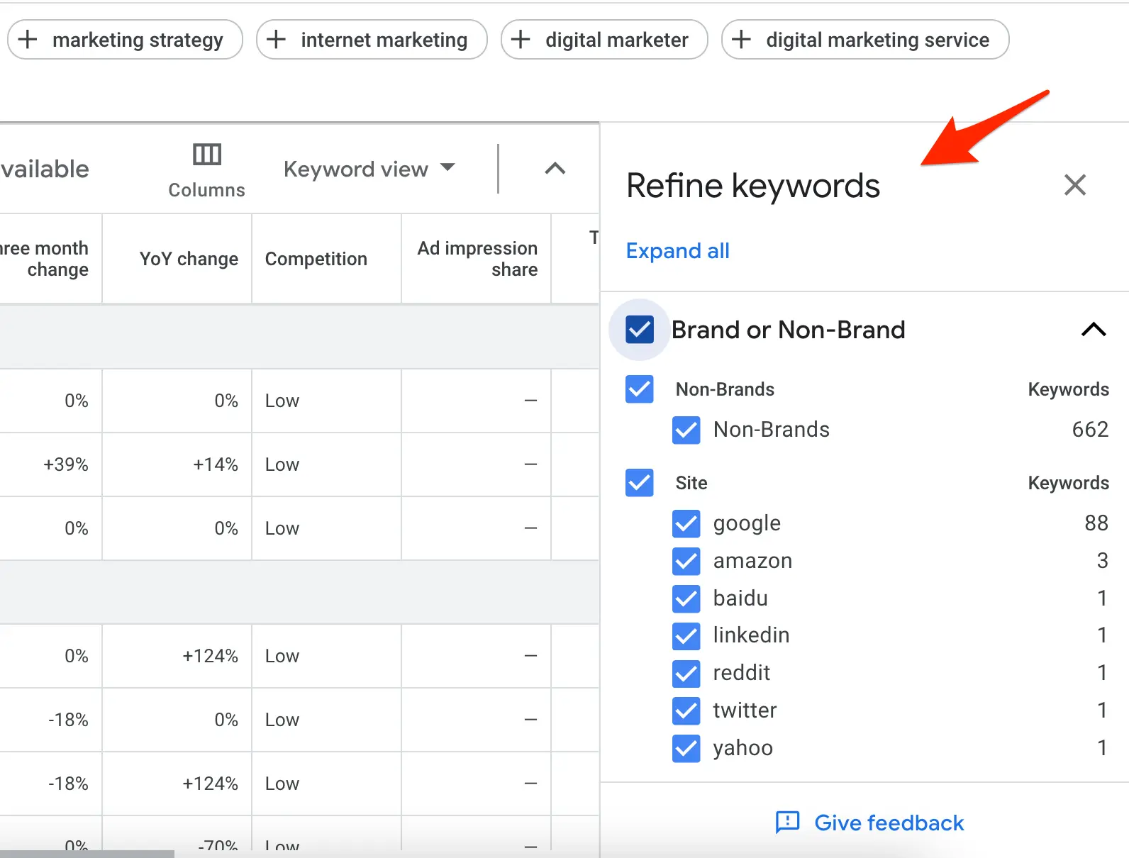 To do that, click the “Refine Keywords” button and navigate the list. Uncheck the box for the keywords you want to exclude.