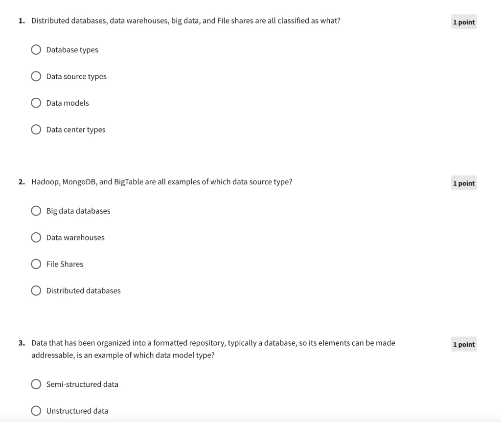 To receive your college credits and IBM certification for this course, you must complete all 8 courses and their associated hands-on projects, quizzes, and tests. Most modules will include review-style quizzes to help you assess your knowledge as you proceed.