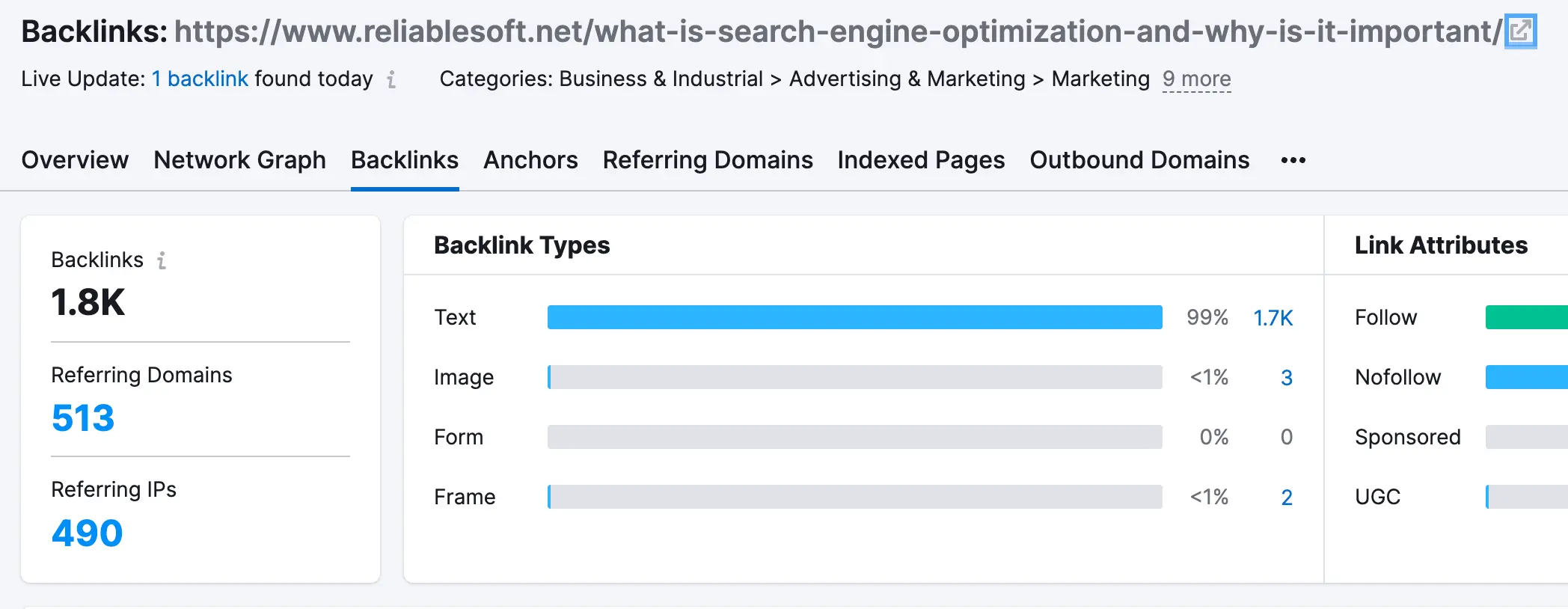 For example, our guide on "What is SEO and Why It's Important." received 1.8K links from 513 domains (including well-known websites )without us building them.