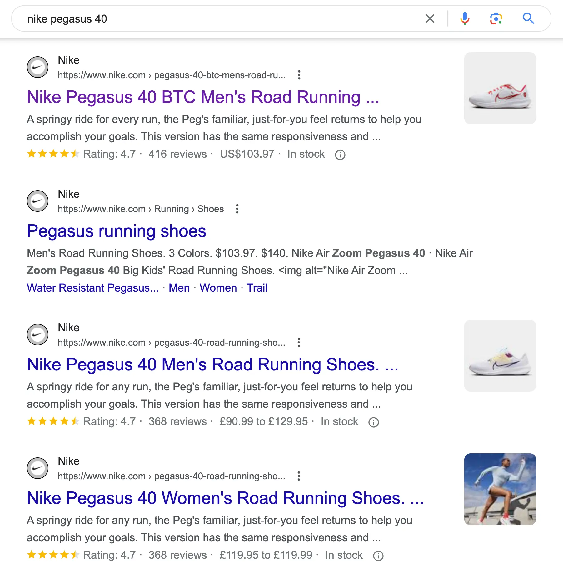 Also, ranking multiple pages for branded keywords is perfectly fine. For instance, consider this example from Nike. They rank for multiple pages for the same keyword, but that's normal for branded searches.