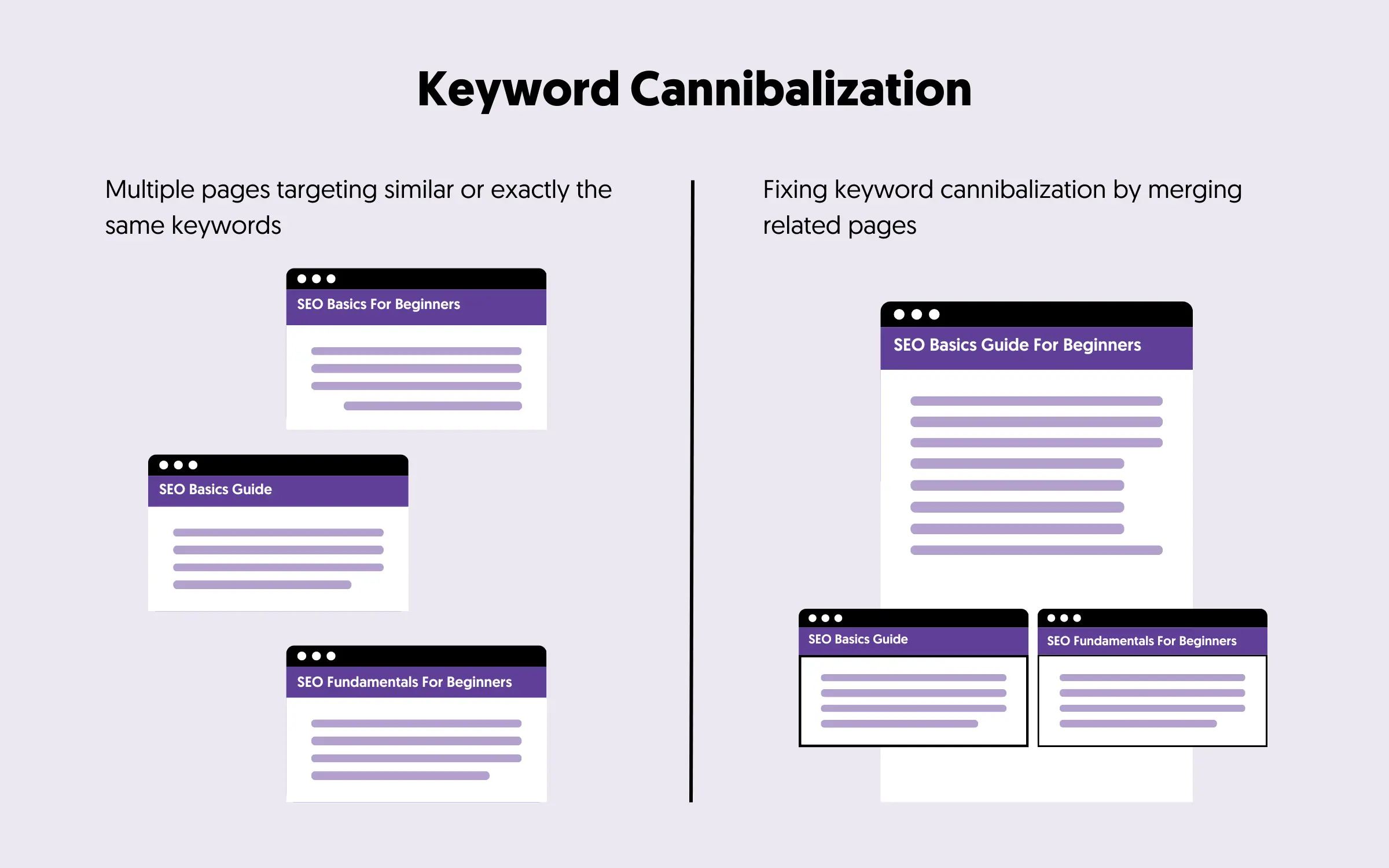 We had three pages titled "SEO Basics Guide," "SEO Basics For Beginners," and "SEO Fundamentals For Beginners." All pages targeted the same (or closely related) keywords and had similar content.