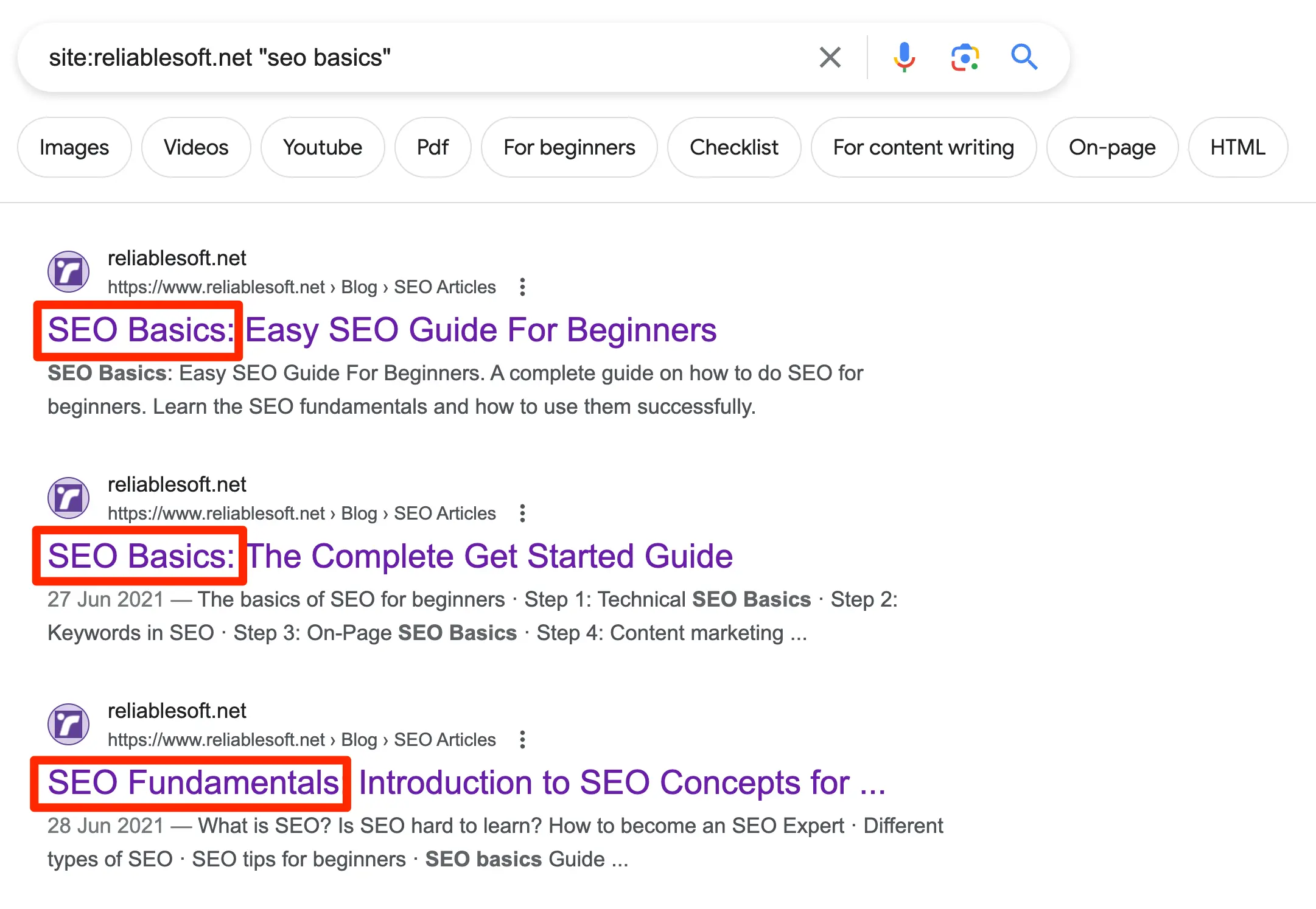 Before writing a new post, we check our existing content to see if we already have an article on a particular topic or similar. We manually review our existing content and use the Site:Search operator to see which pages appear for a particular keyword.