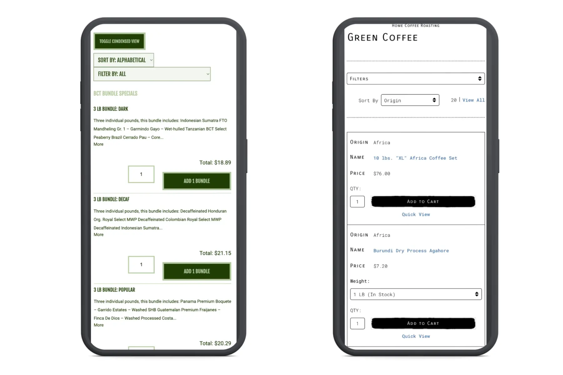 Make sure you review the pages on mobile because this is the version Google users for ranking purposes. For example, if you look at the two top-ranking pages for 'green coffee beans', you'll notice that both landing pages have a clean layout showcasing the different product options. There are no long intros or other elements that prevent users from getting what they want.