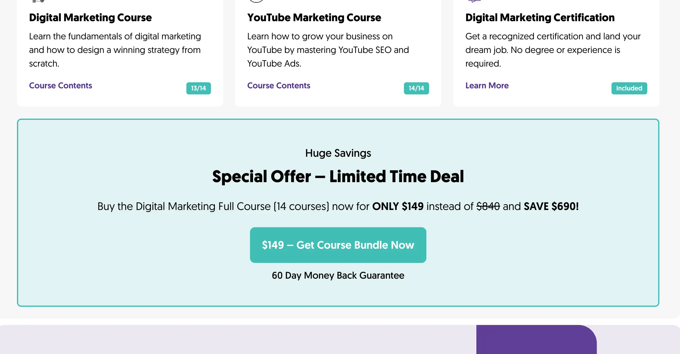Here is an example of how we use discounts and special deals to convert more customers who visit our Digital Marketing Full Course sales page.