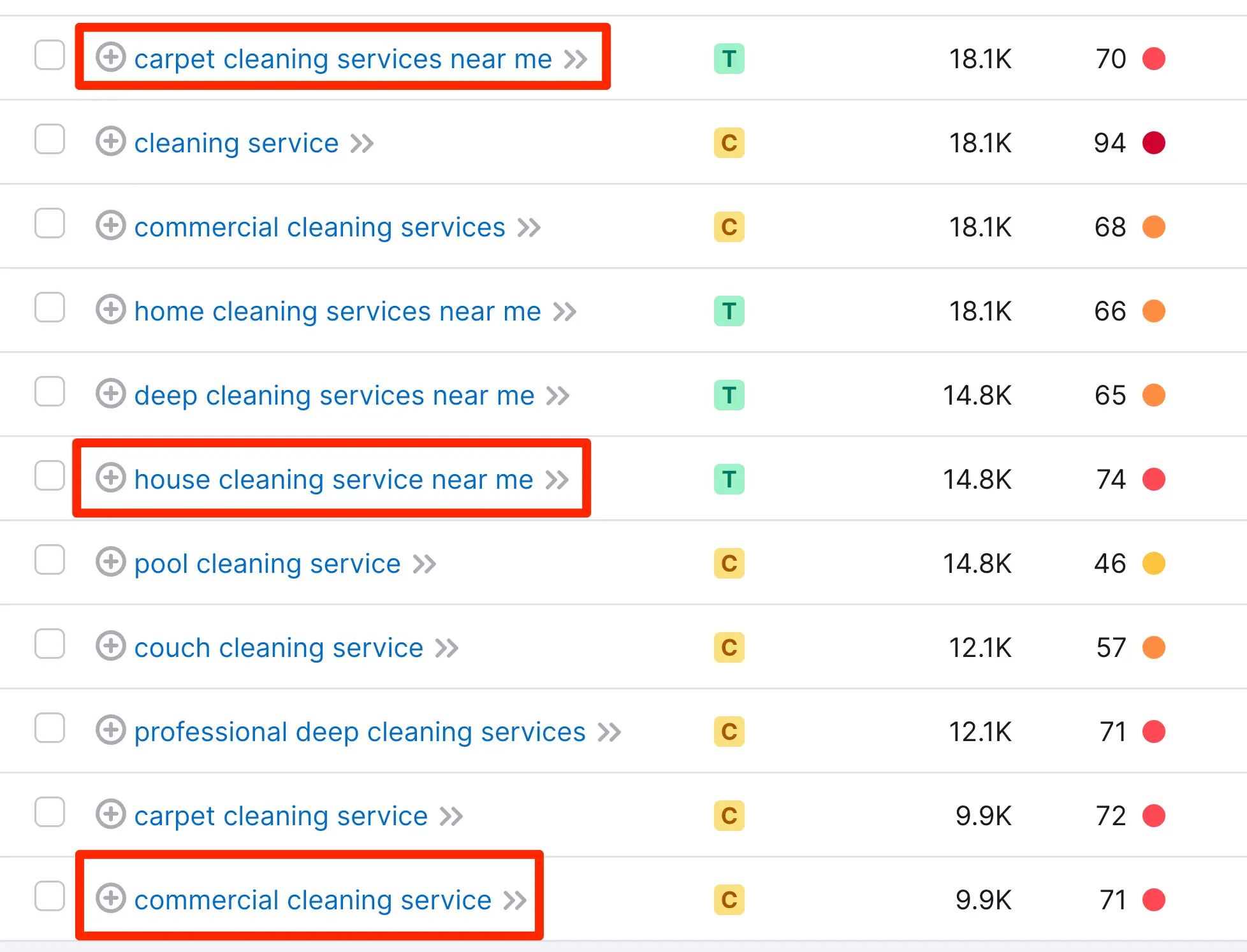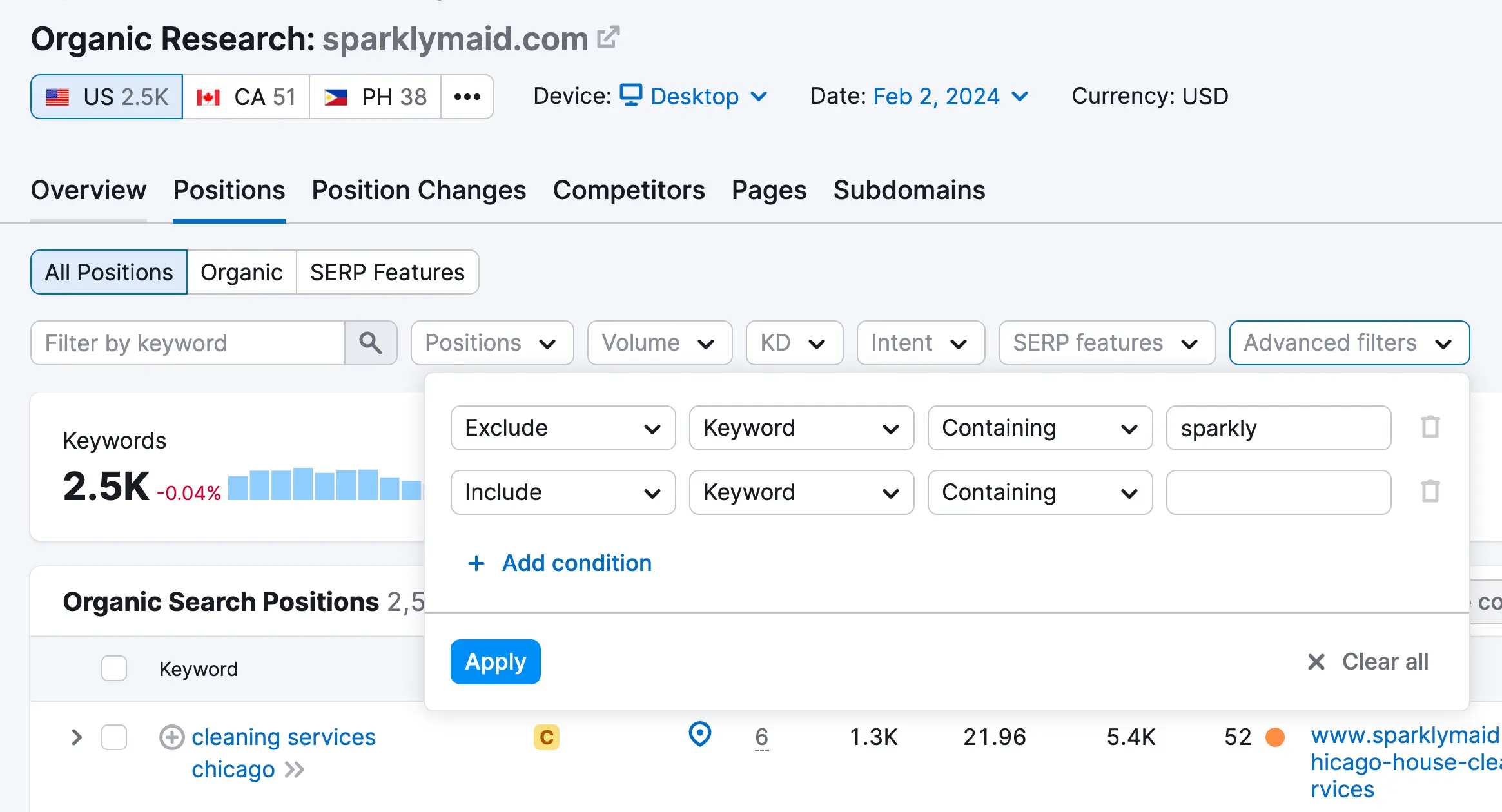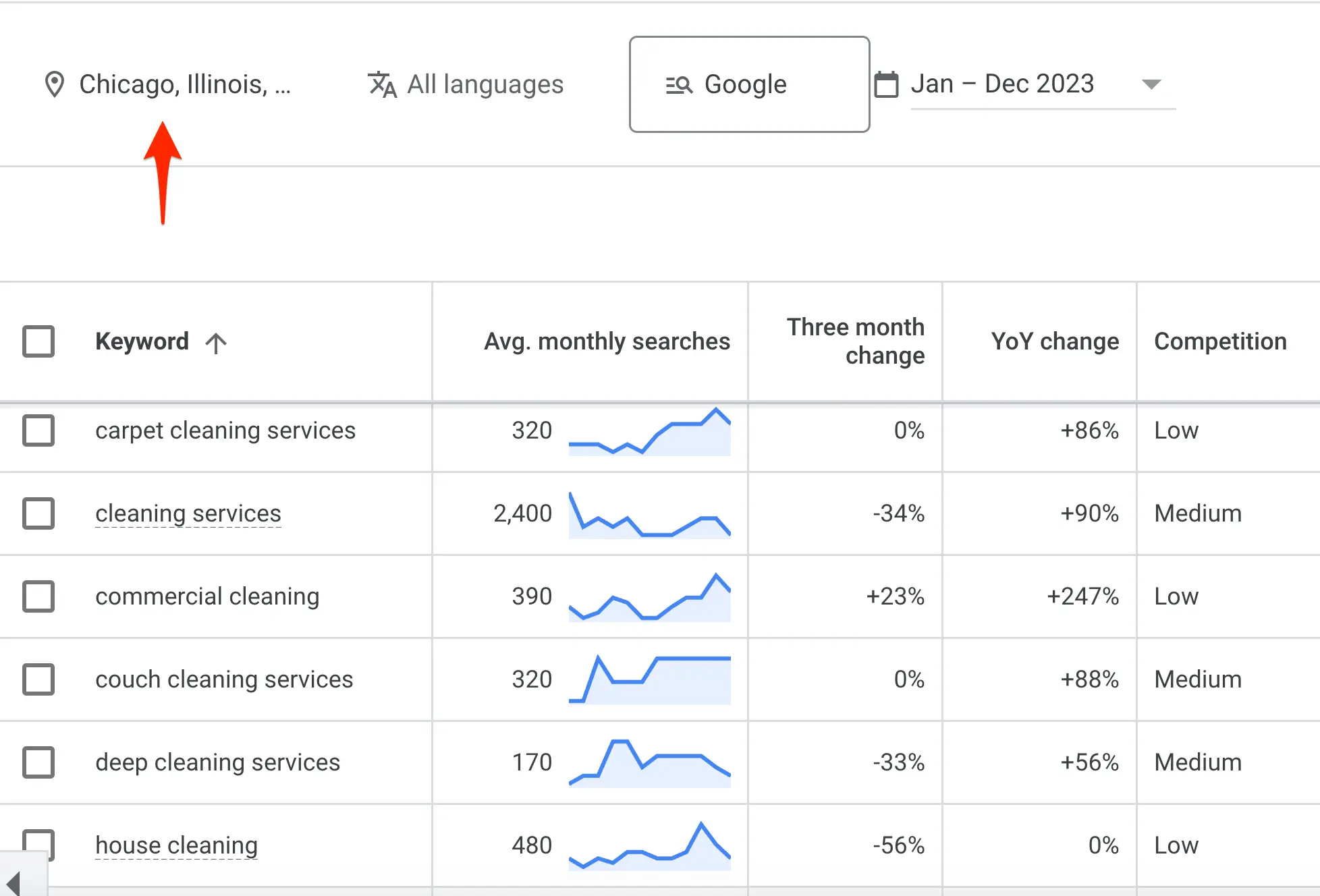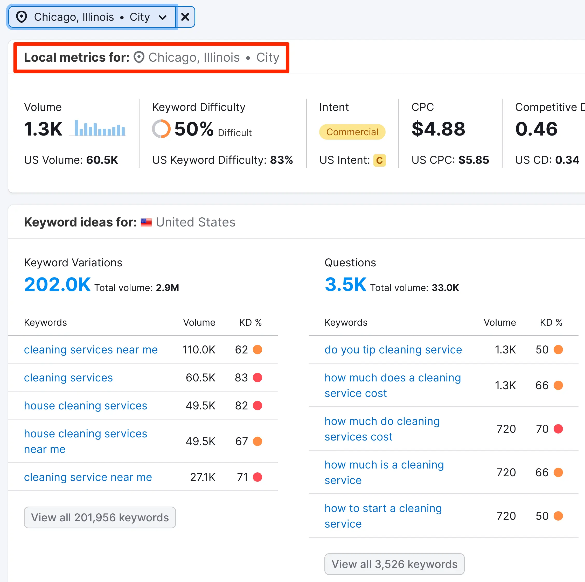 As you can see in the top part of the report, the keyword "cleaning services" has a good local search volume (1.3K). Repeat the process with the rest of the keywords to find which keywords are popular in your service area.