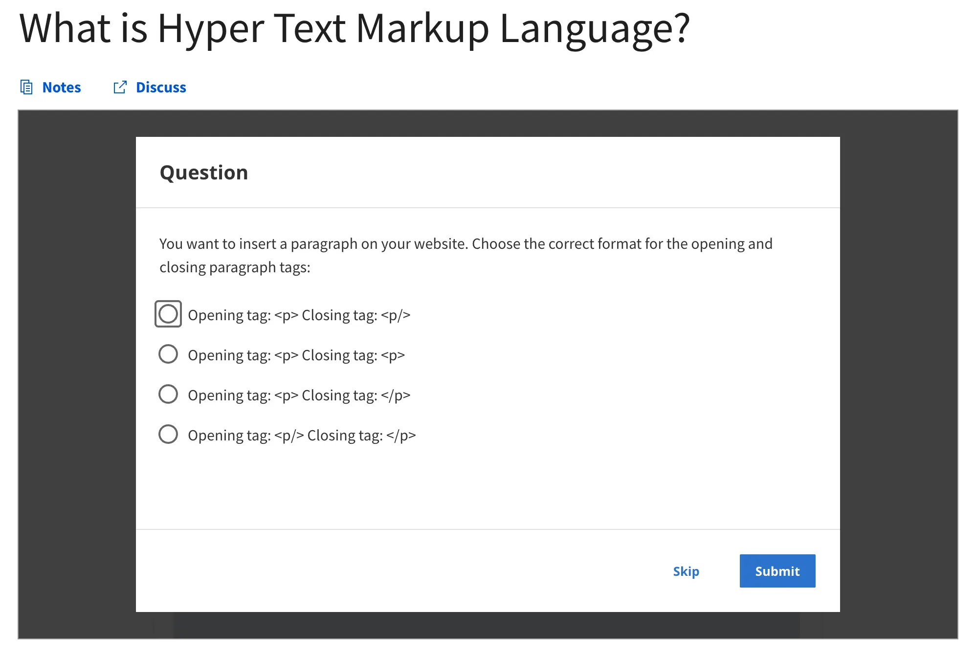 The course is divided into four weeks. During week 1, you’ll explore everything you need to know about core development technologies like HTML, CSS, and JavaScript. You’ll also take a closer look at frameworks, APIs, and internet protocols. This week has a total of 5 practice exercises.