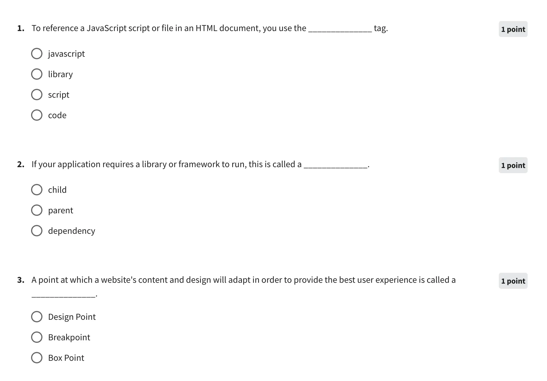 Weeks 2 and 3 introduce HTML, CSS, and UI frameworks. You’ll start with an overview of HTML and CSS basics, and complete 3 practice exercises to test your skills. Next, you’ll learn how to use the Bootstrap framework for building responsive exercises, and use 5 quizzes to test your knowledge.