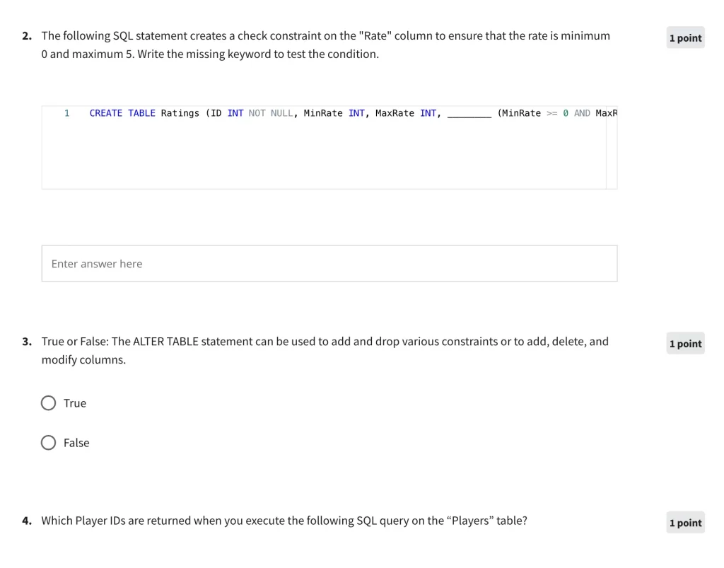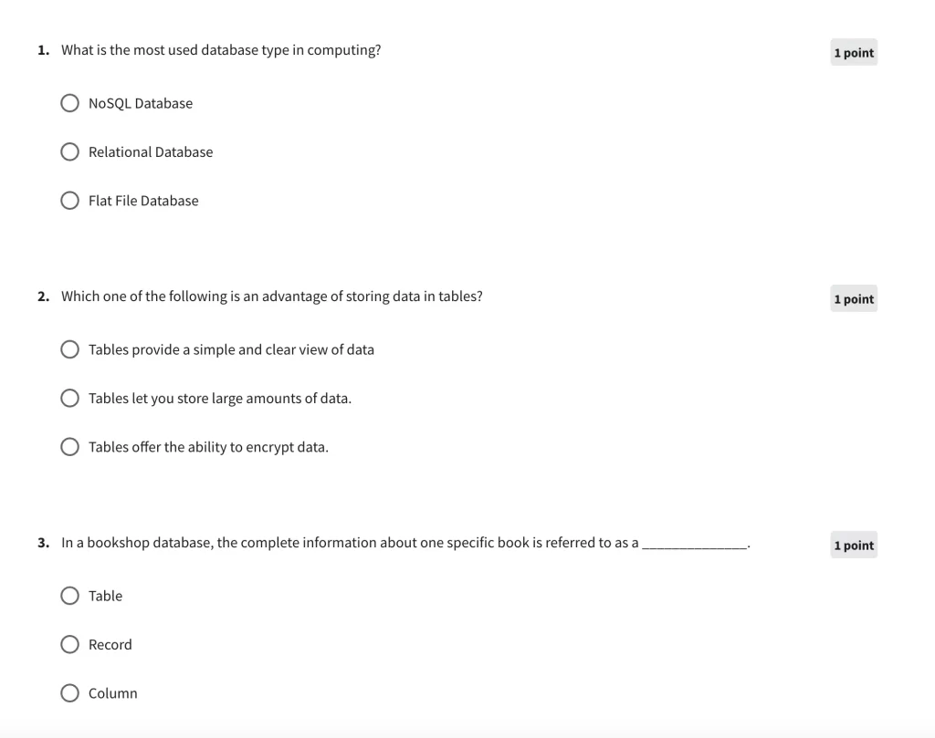 Week 4 introduces the concept of database design and how to use different types of database normalization techniques. There are also various knowledge reviews and quizzes to complete.