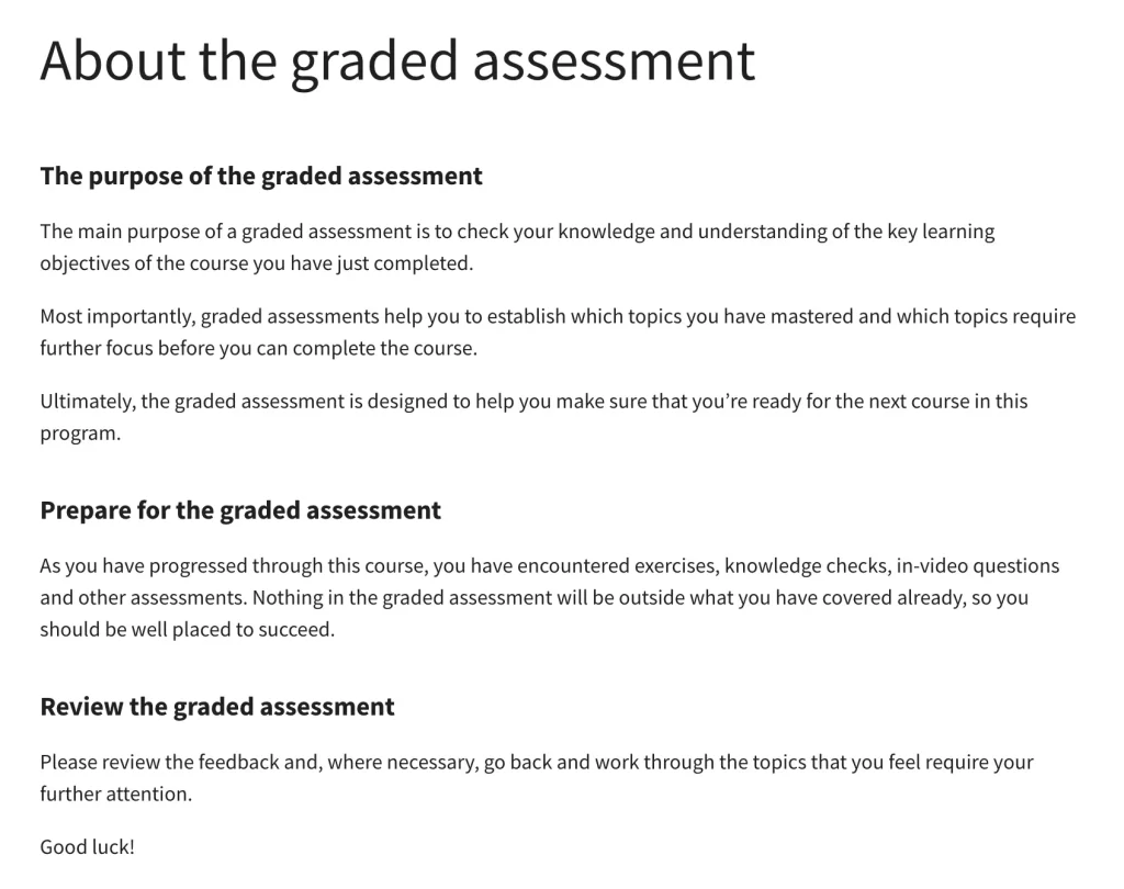 The final week of the course asks students to complete a graded assessment where they can showcase what they’ve learned so far and identify strengths and weaknesses.