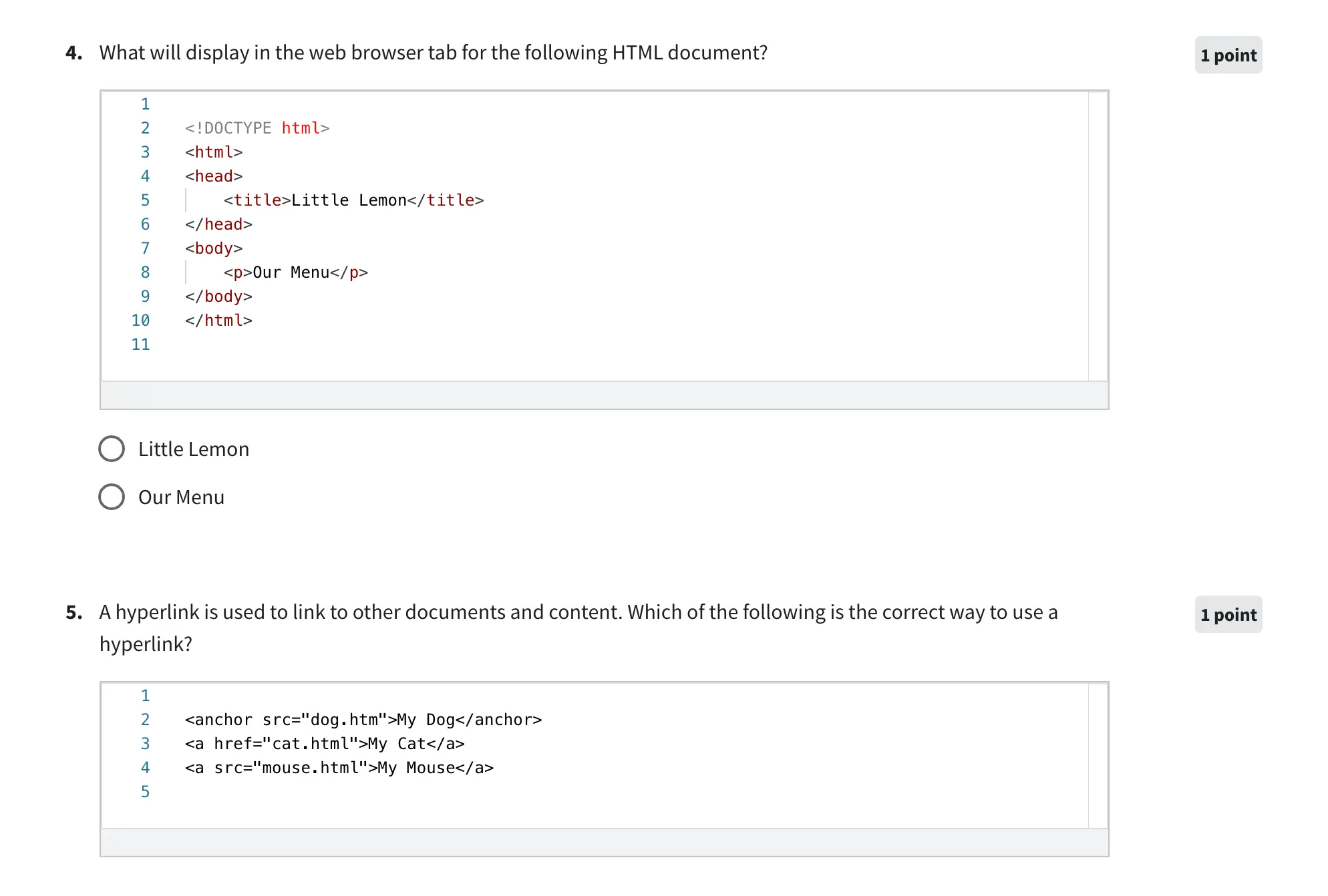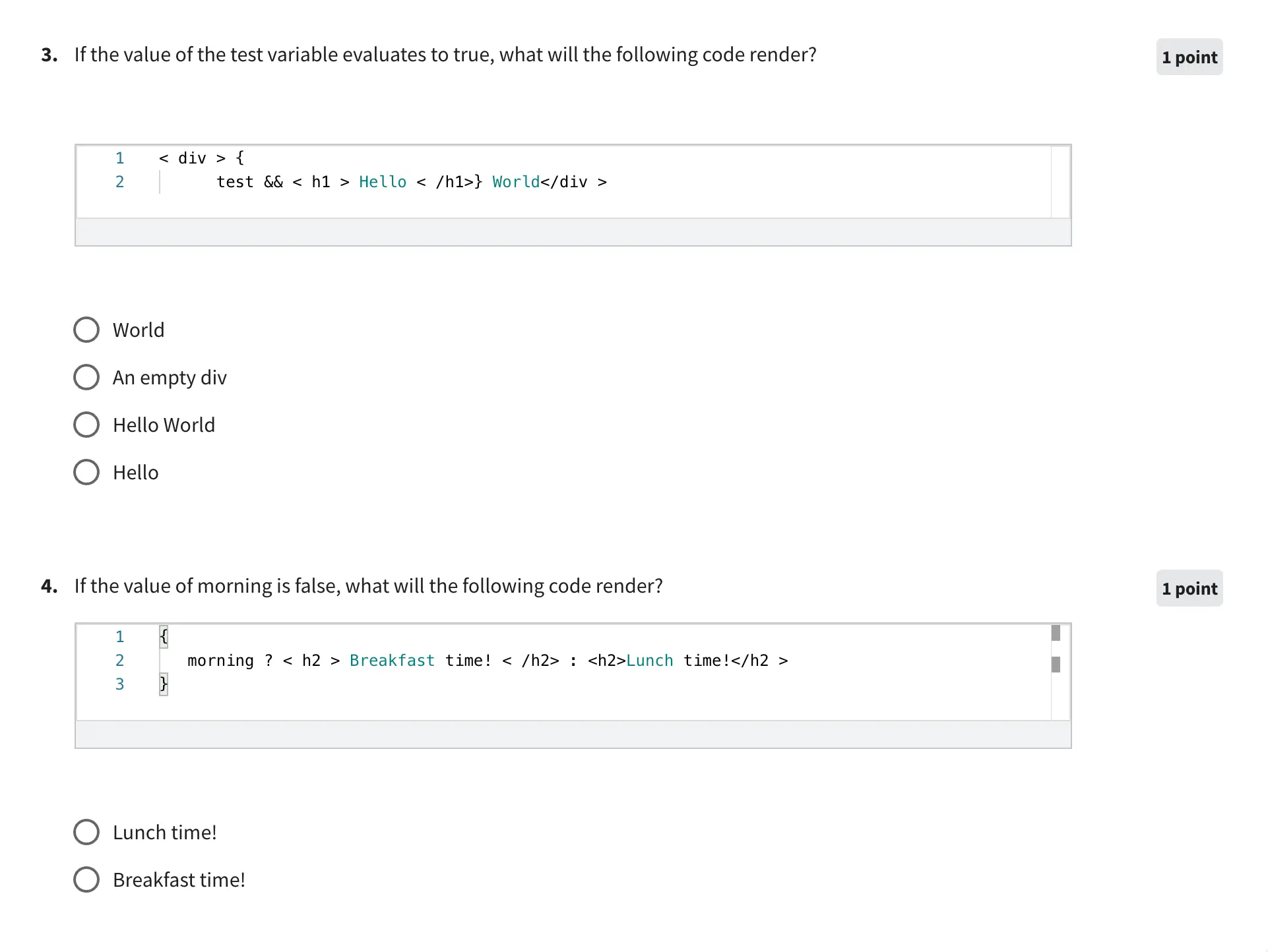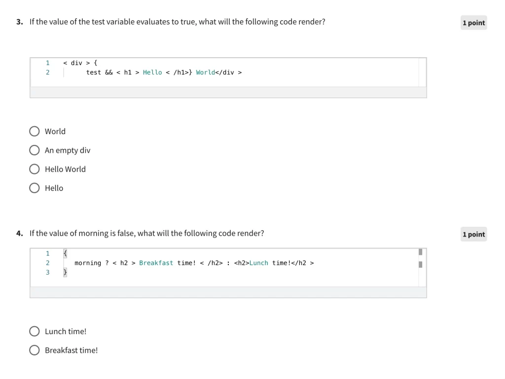 Some of the quizzes are simple multiple-choice questions. However, others will require you to implement your skills in the creation of front-end applications and user interfaces.