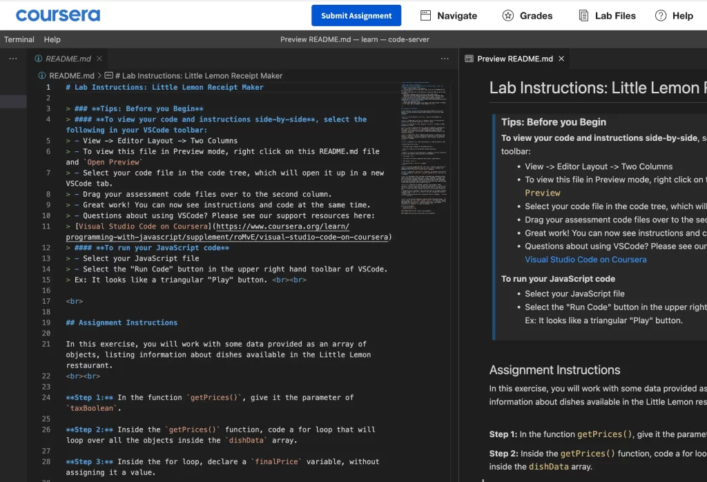 At the end of the 5 weeks, there’s a graded assessment where you’ll create code for the “Little Lemon Receipt maker”, and complete 3 quizzes.