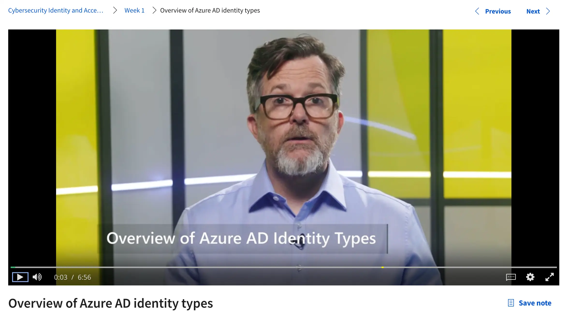 During week 2, you’ll look at all of the different features and authentication methods in Azure AD. The instructor covered concepts like vaults, Single-sign-on, multi-factor authentication, hybrid identities, and password validation.