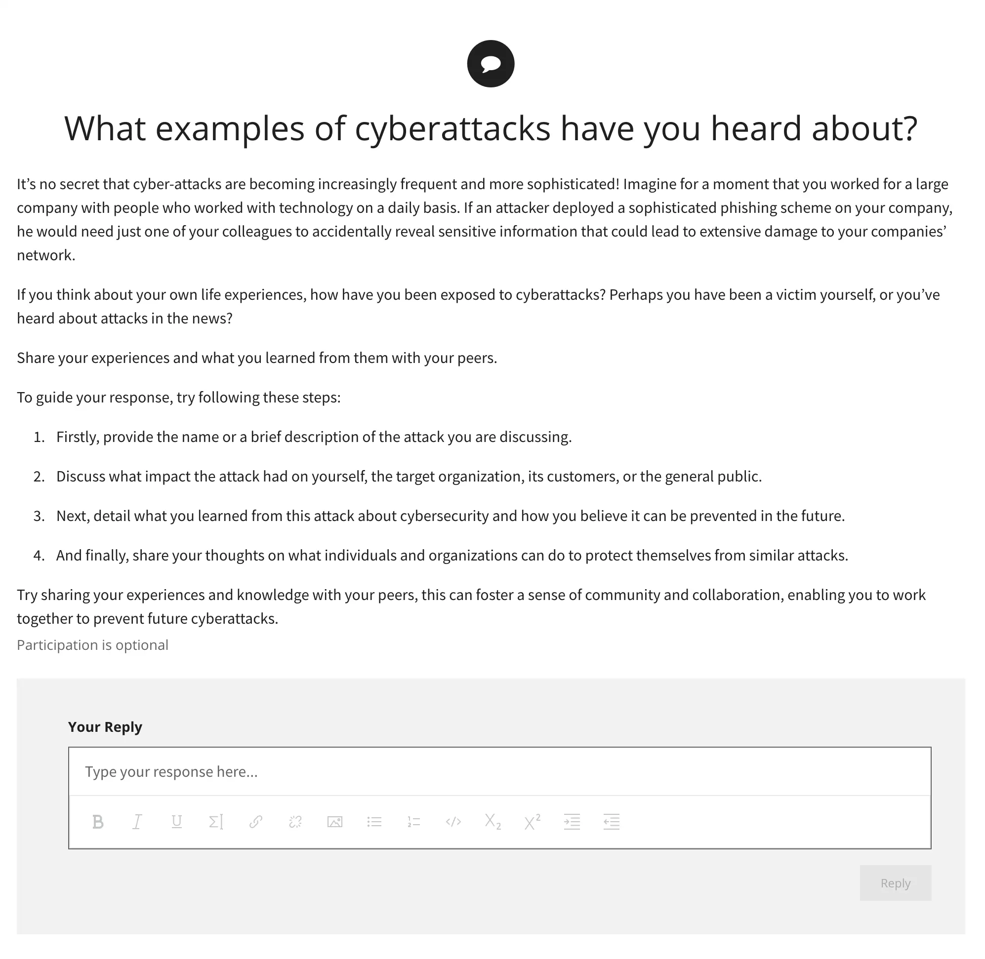 Through a mixture of assessments, hands-on learning projects, and videos, students learn how cybersecurity concepts can be successfully applied to a business environment.