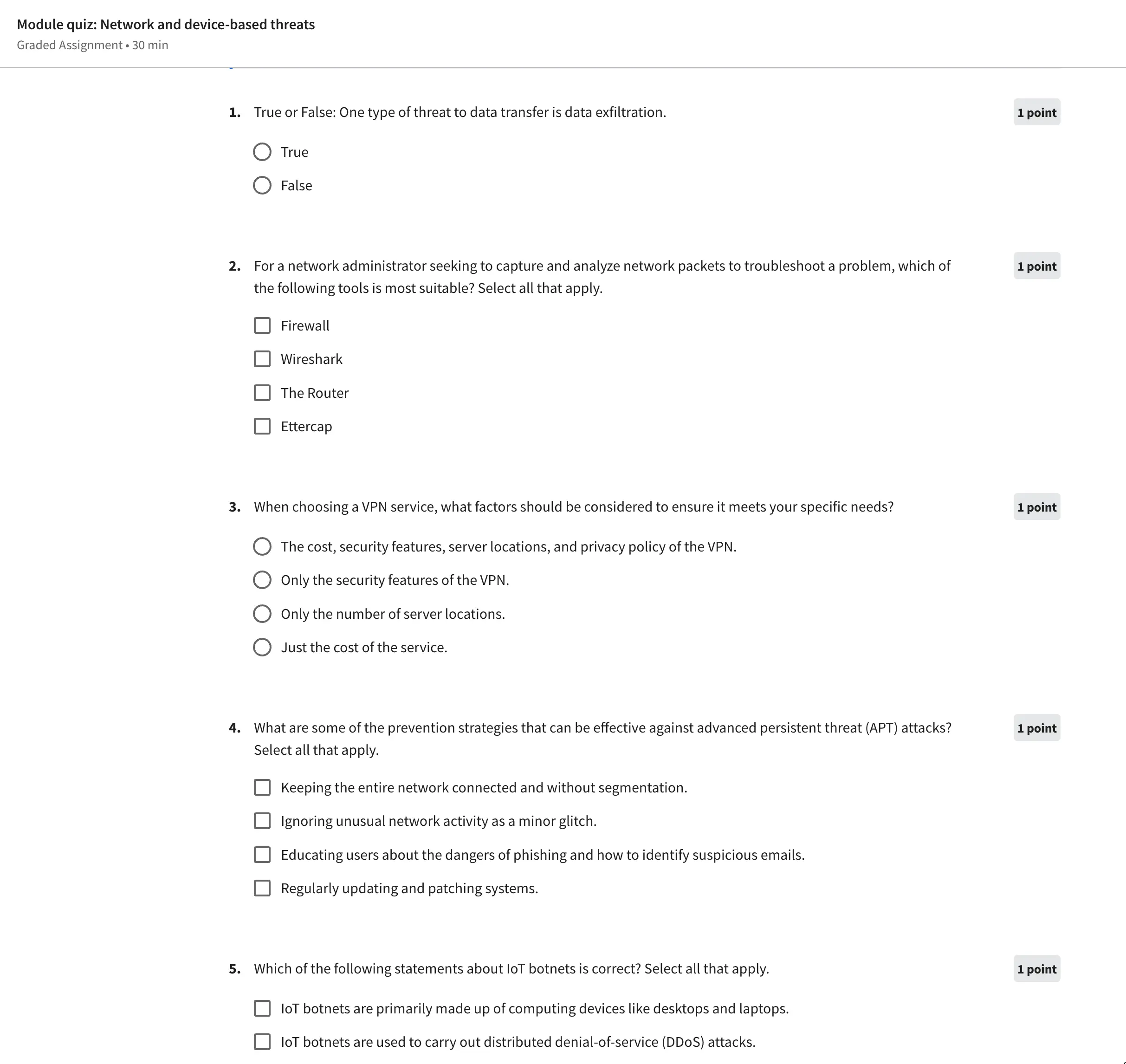 Week 3 looks at network and device-based threats. You’ll learn about advanced persistent threats, data transmission, firewall optimization, and network segmentation. There are some helpful readings to guide you through the process of implementing encryption tools.