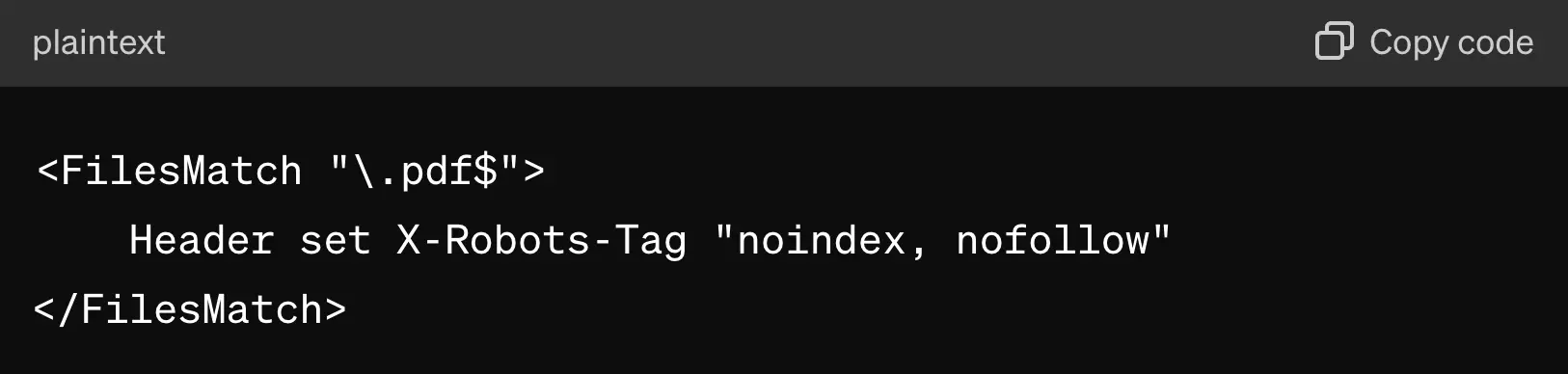 For example, you can exclude PDF files from being indexed by adding the following code to your .htaccess file.
