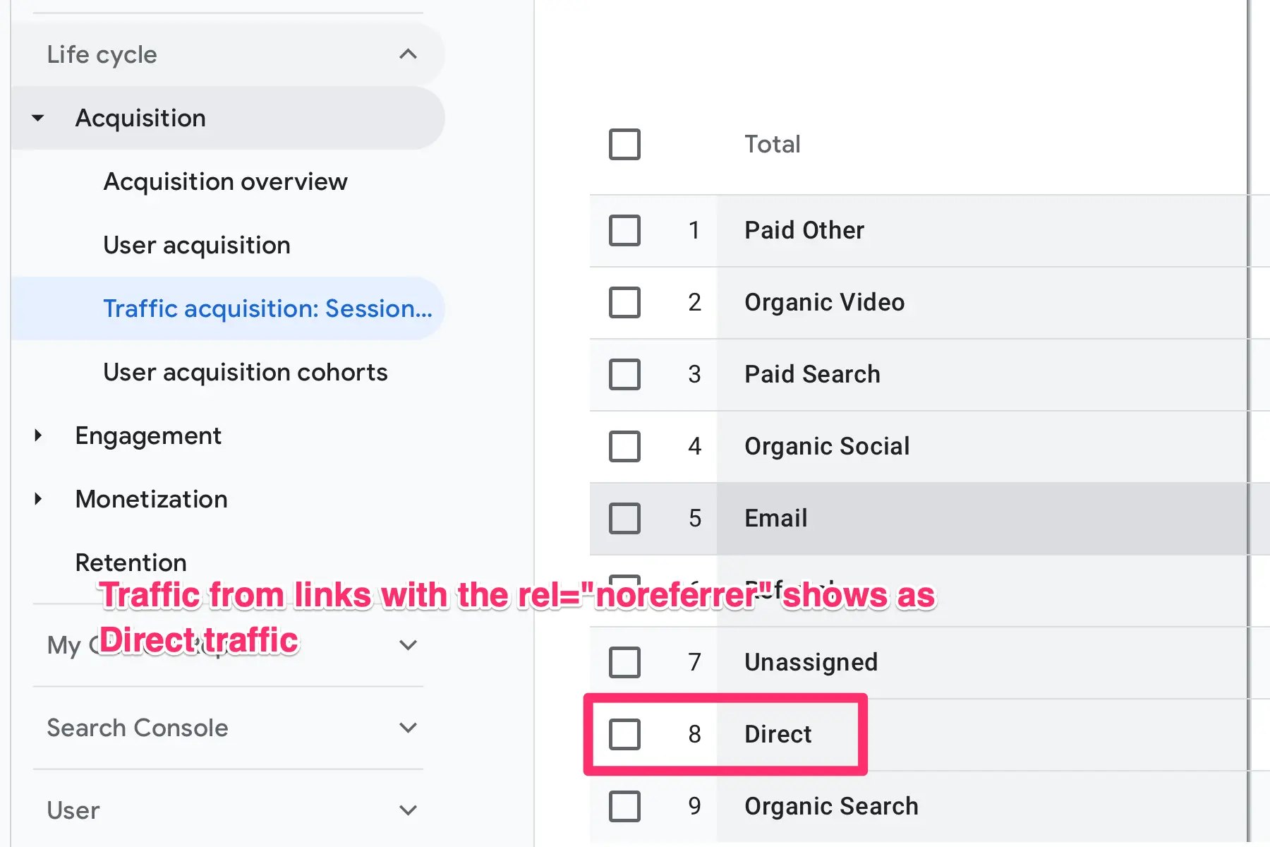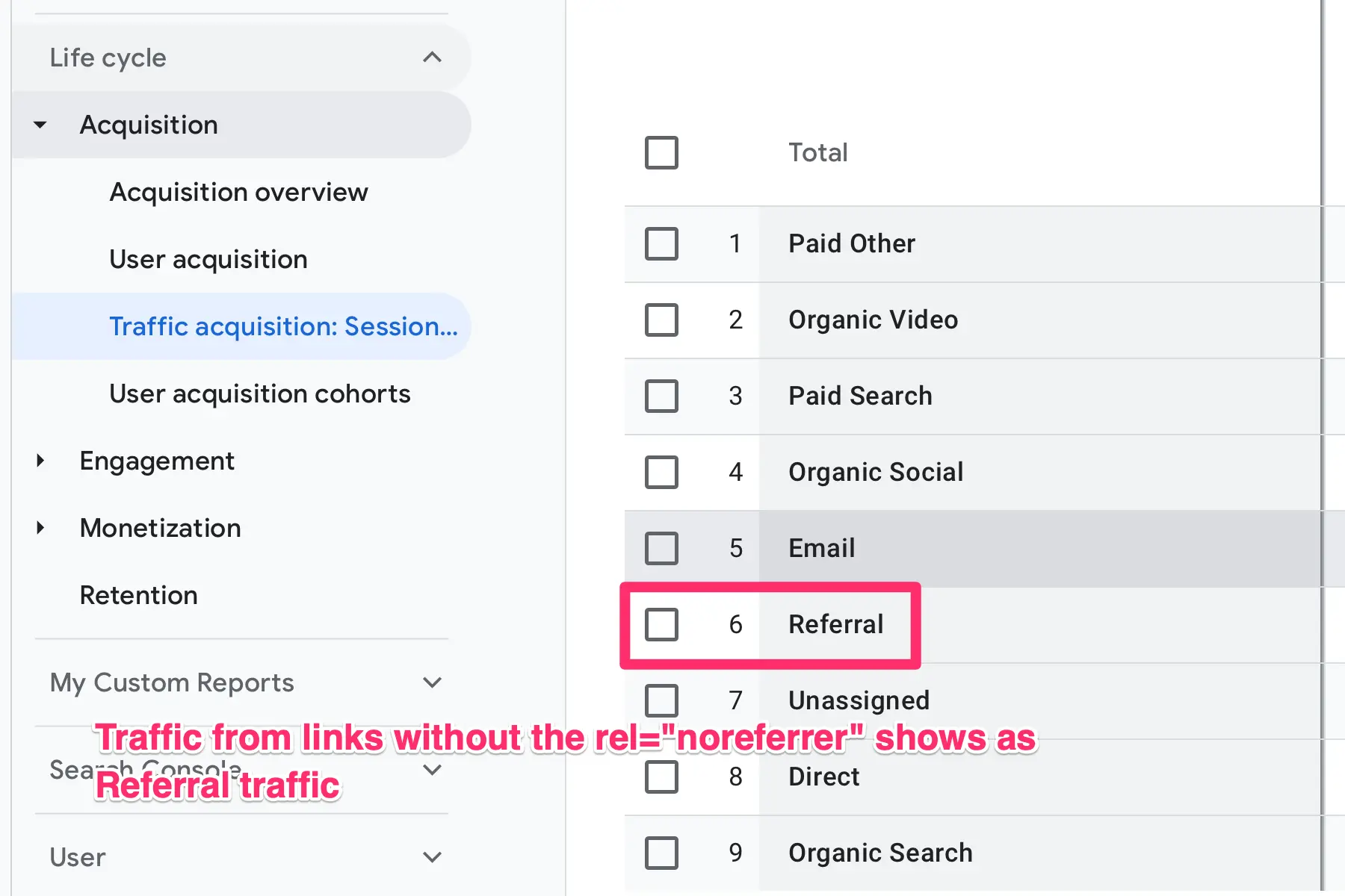 This means that in Google Analytics, traffic from links with the rel="noreferrer" attribute will show as Direct Traffic instead of Referral.