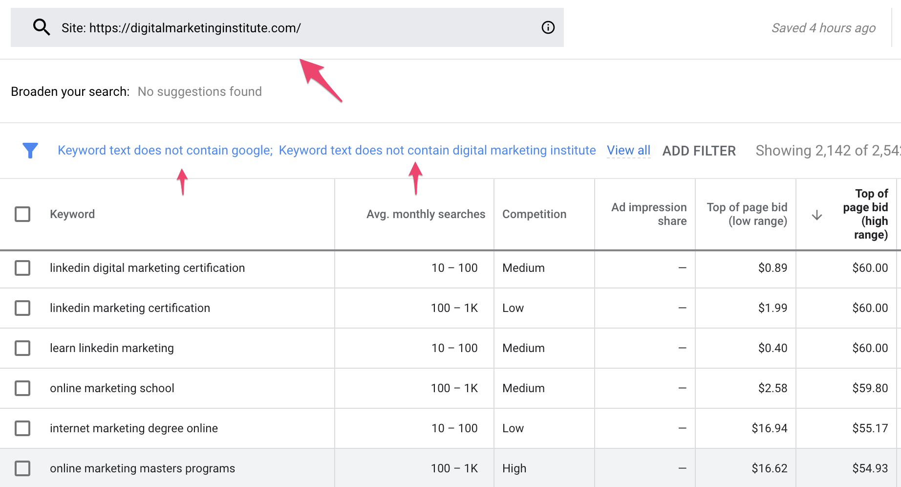 Another free tool you can use is Google Keyword Planner. This tool is used for keyword research for your Google Ads campaigns, but you can also use it to find out which keywords a website is targeting.