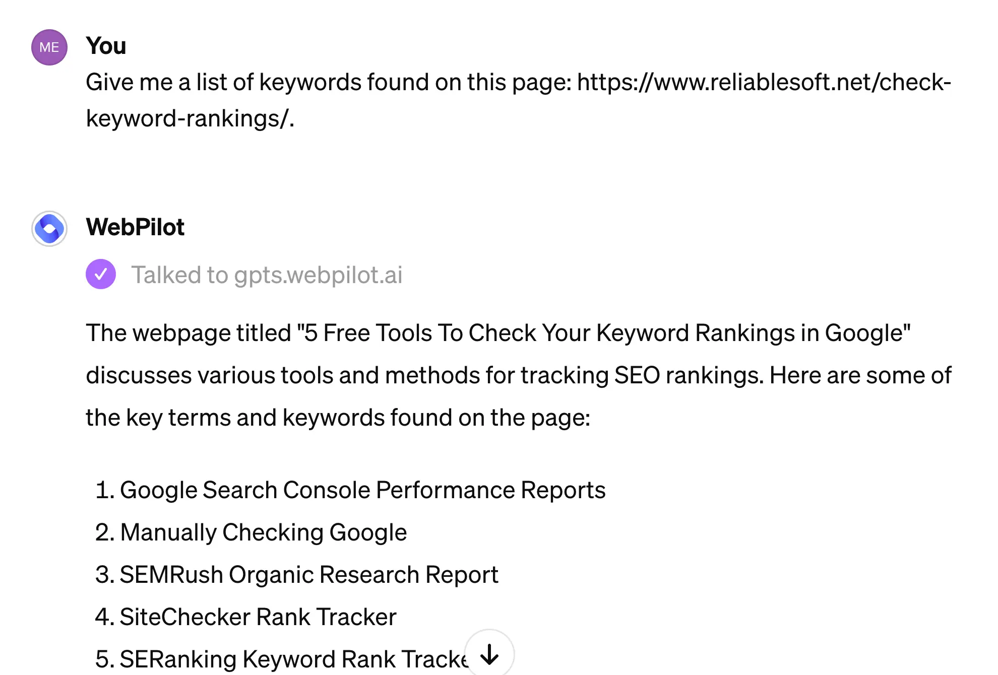 - Enter the following prompt: "Give me a list of keywords found on this page: [enter the page URL]"