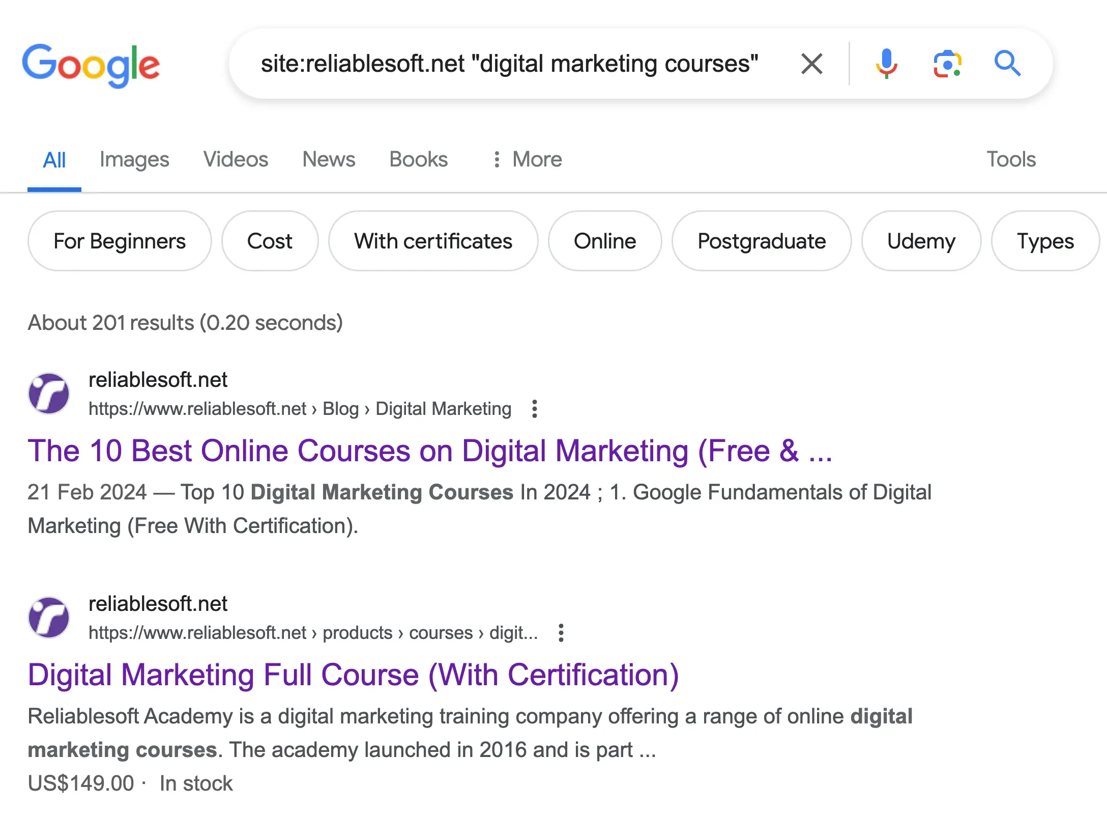 To search my website for the keyword "digital marketing courses", the command to use is site:reliablesoft.net "digital marketing courses".