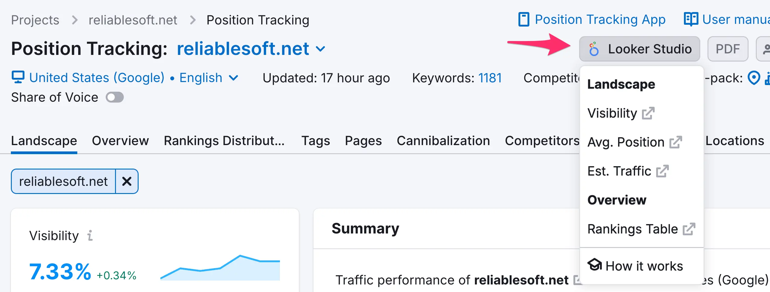 For example, if you want to analyze your keyword rankings in Looker Studio, you can click the 'Rankings Table' option, which will automatically create a report connected to your Semrush data.